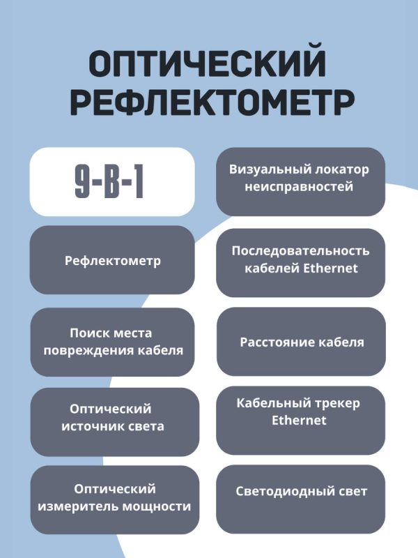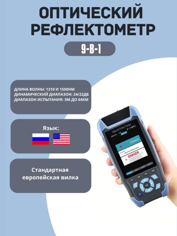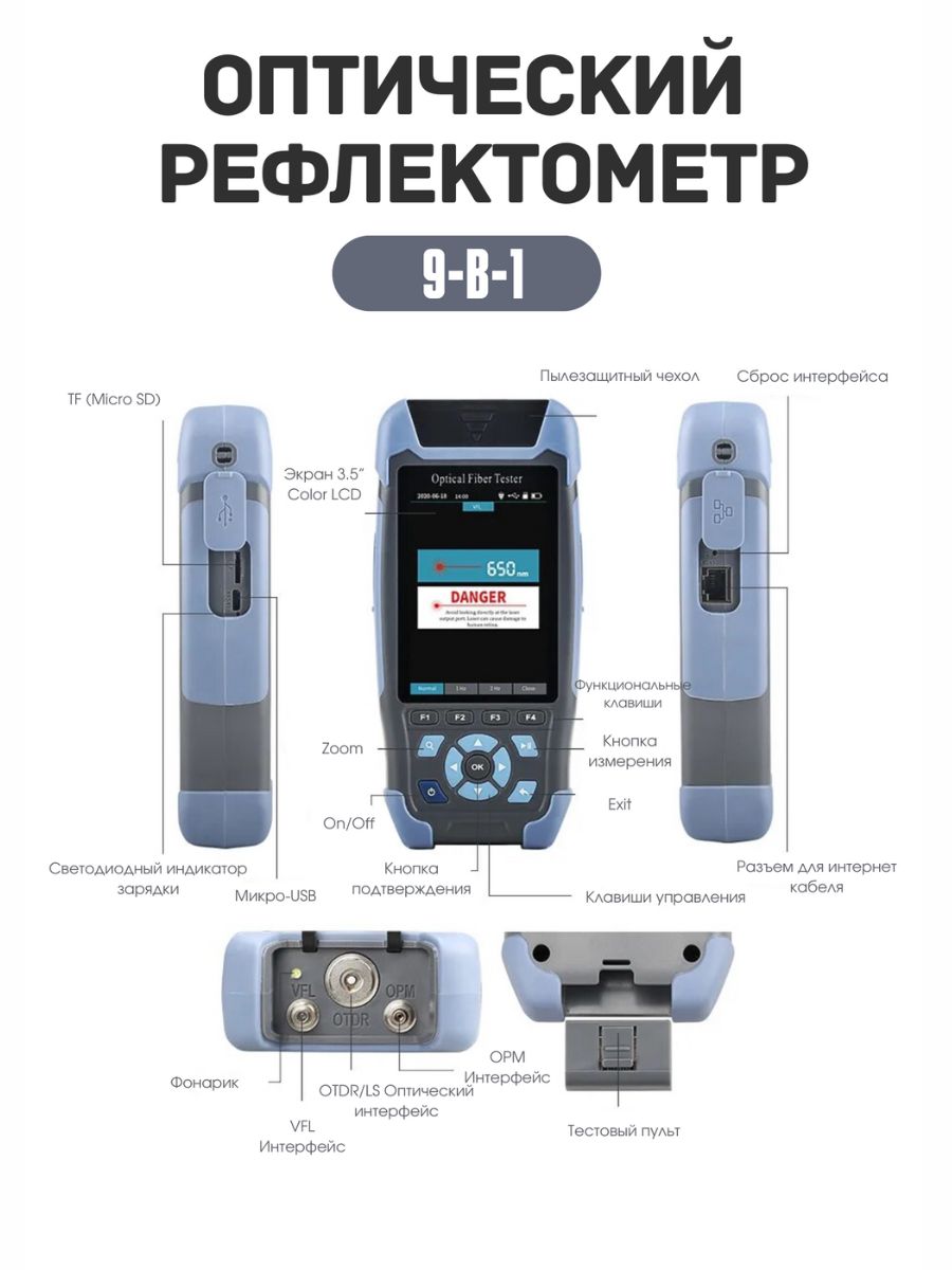 Влажность< 95% Входное напряжение АС 100 — 200 В, 50-60 Гц Тип батареи: литий-ионный аккумулятор, ёмкость 4000 мАч Время работы от заряженного аккумулятора∼ 12 часов Интерфейс USВ, ОТDR, VFL, ОРМ, RJ45, порт для зарядки Рефлектометр 980REV Mini Pro OTDR — это надежное и универсальное измерительное устройство, предназначенное для использования в области строительства и ремонта. Этот рефлектометр является неотъемлемым инструментом для профессионалов, занимающихся измерением и контролем оптических сетей. Он обладает множеством полезных функций, которые делают его идеальным выбором для работы с оптическими волокнами. Рефлектометр 980REV Mini Pro OTDR обеспечивает точное измерение потерь сигнала, длины волны и времени задержки, что позволяет быстро и эффективно настраивать и отлаживать оптические системы. Компактный и легкий дизайн рефлектометра 980REV Mini Pro OTDR делает его удобным для работы в любых условиях. Большой яркий экран позволяет легко читать данные даже при ярком солнечном свете или в плохо освещенных помещениях. Оптический рефлектометр 980REV Mini Pro OTDR поддерживает широкий диапазон длин волн.