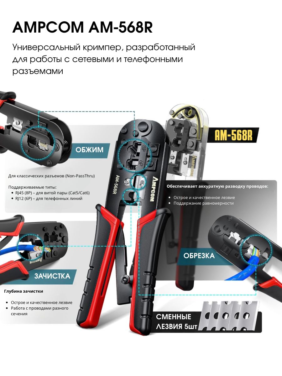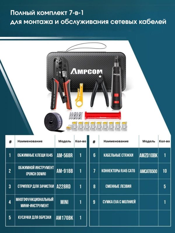 Набор инструментов AMPCOM — это идеальное решение для тех, кто работает с Ethernet кабелями. Этот набор включает в себя 7 инструментов, которые помогут вам быстро и эффективно выполнять различные задачи, связанные с витой парой: