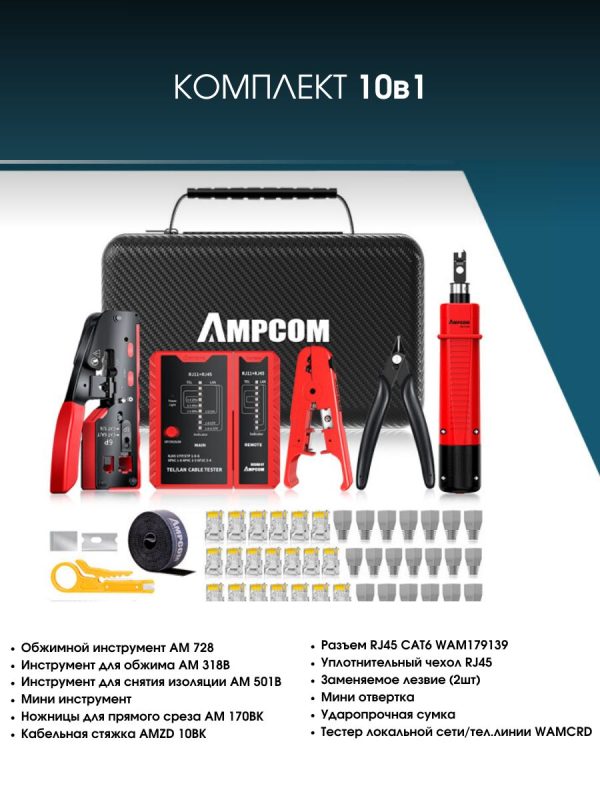 AMPCOM LAN 10 в 1 – это универсальное решение, которое обеспечит вас всеми необходимыми инструментами для работы с сетевыми кабелями и коннекторами. Компактная упаковка позволяет легко хранить набор и брать его с собой на объект. Никаких проблем с его транспортировкой!