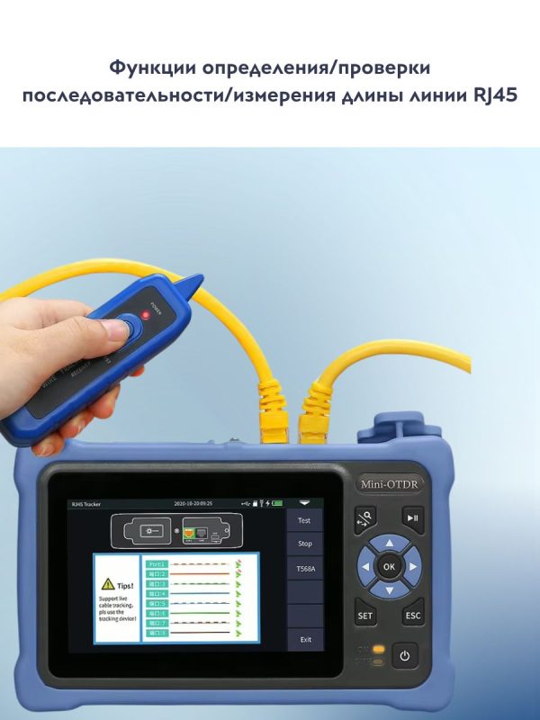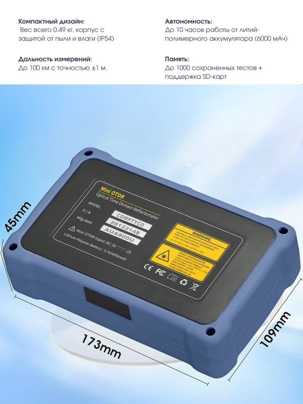 | Комплектация | Рефлектометр, адаптер SC, гарантийный сертификат, адаптер (EC), кабель type-C, приемник, Сумка для переноски |