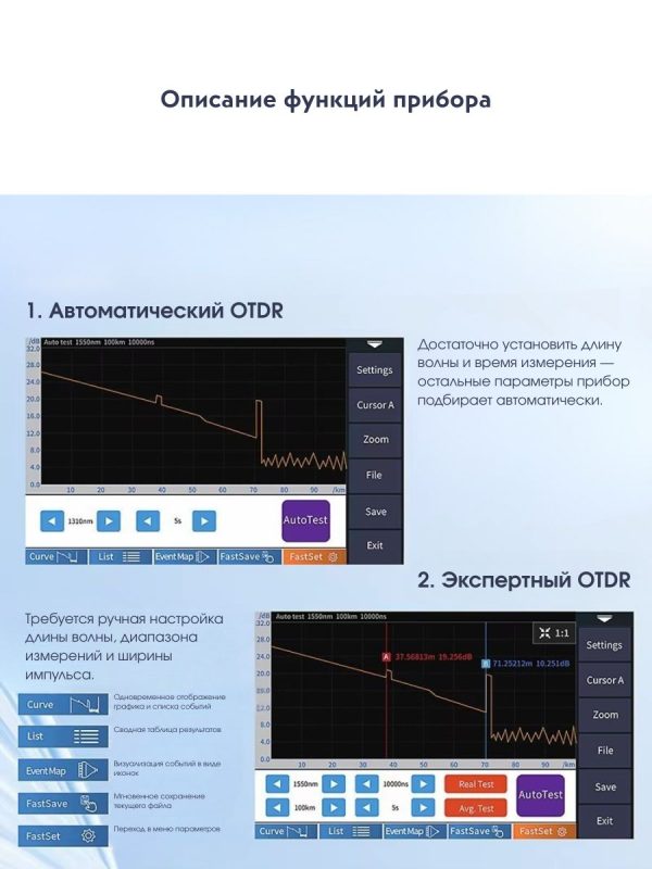Профессиональный рефлектометр OTDR AUA800A предназначен для диагностики и тестирования оптоволоконных линий с возможностью измерения на длине до 100 км. Устройство оснащено 4.3-дюймовым цветным сенсорным экраном, поддерживает функции автоматического тестирования и масштабирования жестами. Модель доступна в версиях с различными типами портов: UPC (AUA800U) и APC (AUA800A). Предлагается в комплектации с двухволновым тестированием на длинах волн 1310/1550 нм. Дополнительные функции включают RJ45 для тестирования кабелей, измерение мощности света и возможность работы с несколькими частотами. Комплект поставки включает все необходимые аксессуары для начала работы, включая переходники, чистящие материалы и защитный кейс.