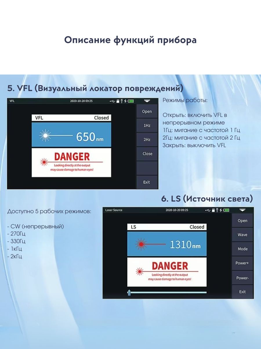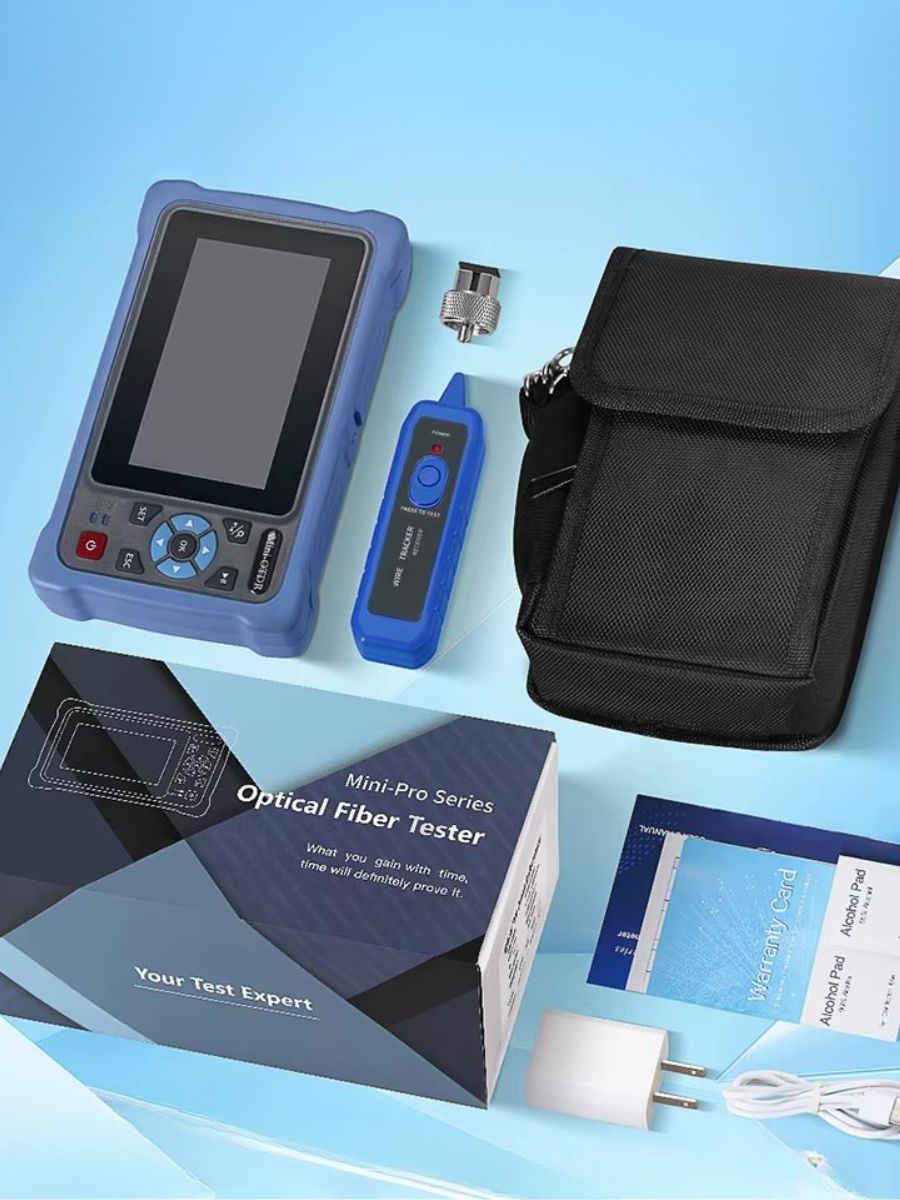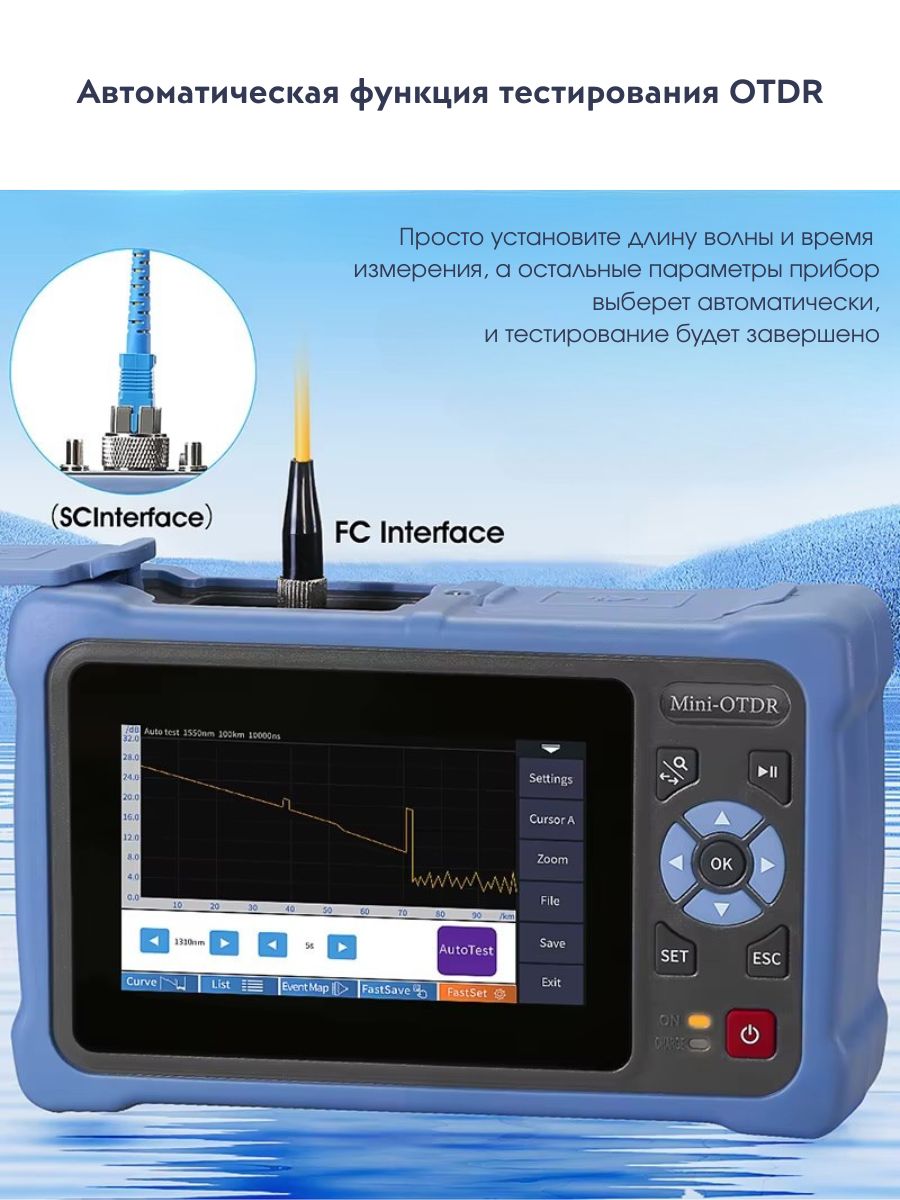 | Комплектация | Рефлектометр, адаптер SC, гарантийный сертификат, адаптер (EC), кабель type-C, приемник, Сумка для переноски |
