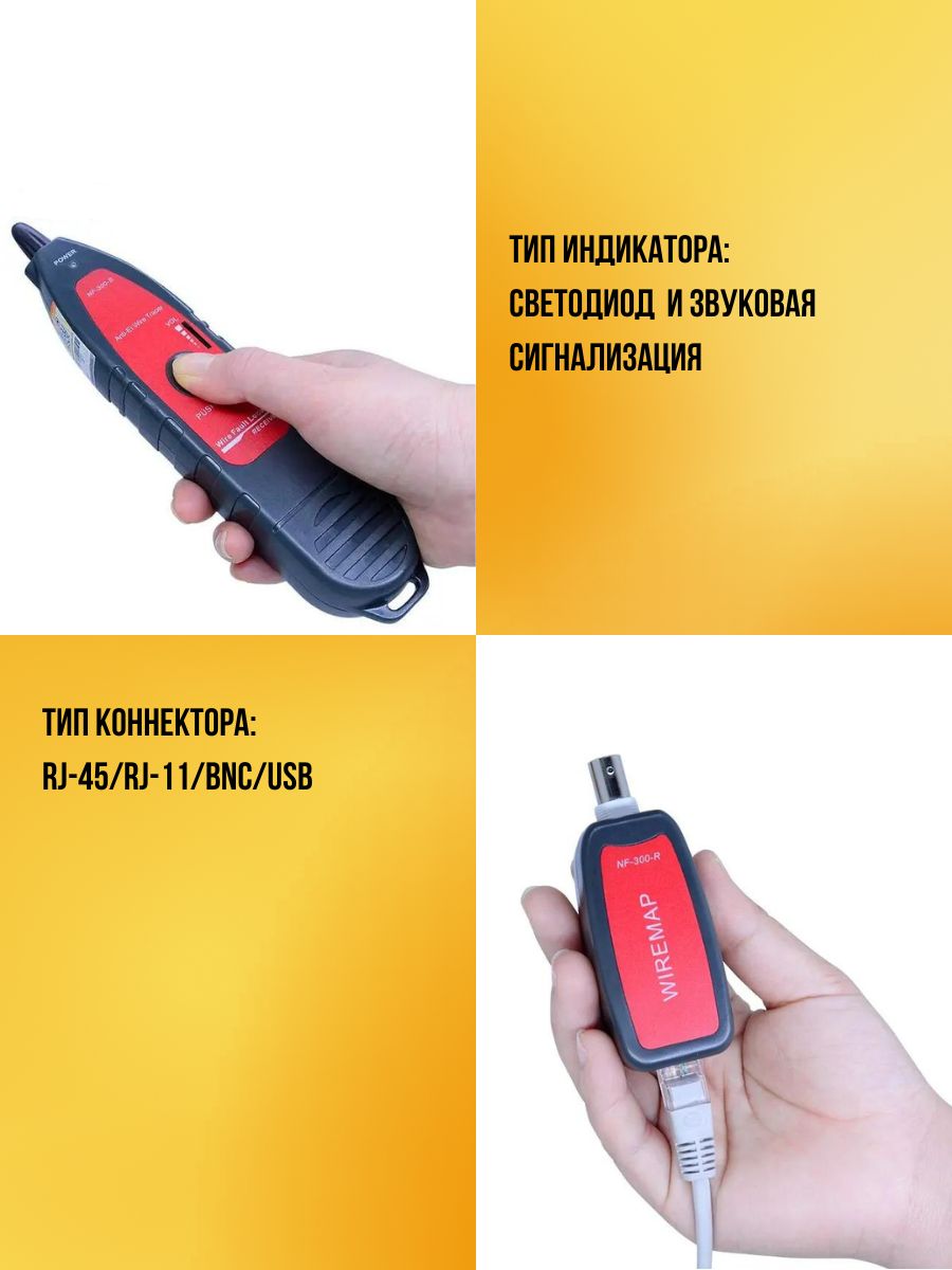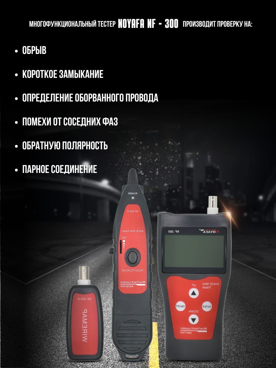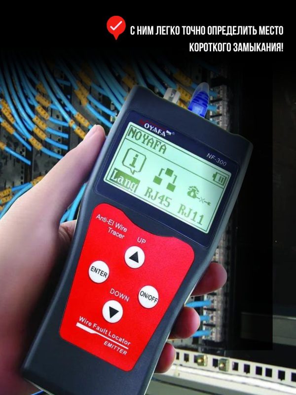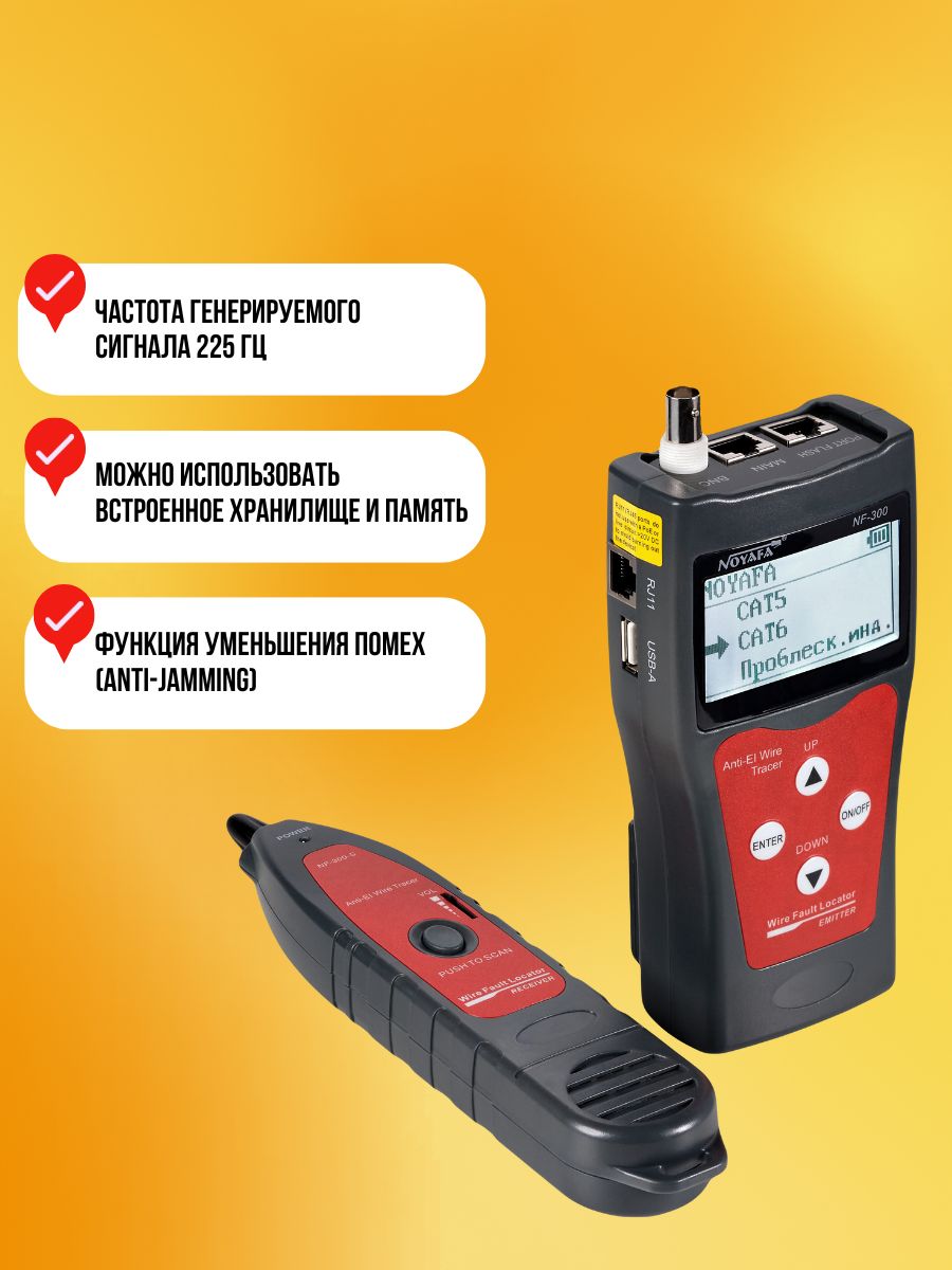 NF300 — многофункциональный кабельный тестер с функцией трассоискателя и измерителя расстояний. Используется для проверки витых пар, определения длины кабеля, обнаружения наличия кабеля, помех от фаз, точек перекрестных помех и обрывов.