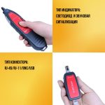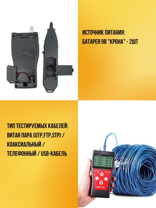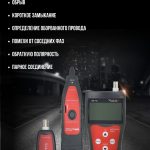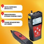 • Типы определяемых кабелей: витая пара STP/UTP 5E, 6E, телефонный кабель, коаксиальный кабель, USB-кабель и различные типы кабелей с металлическими проводниками – при помощи зажимов-крокодилов.