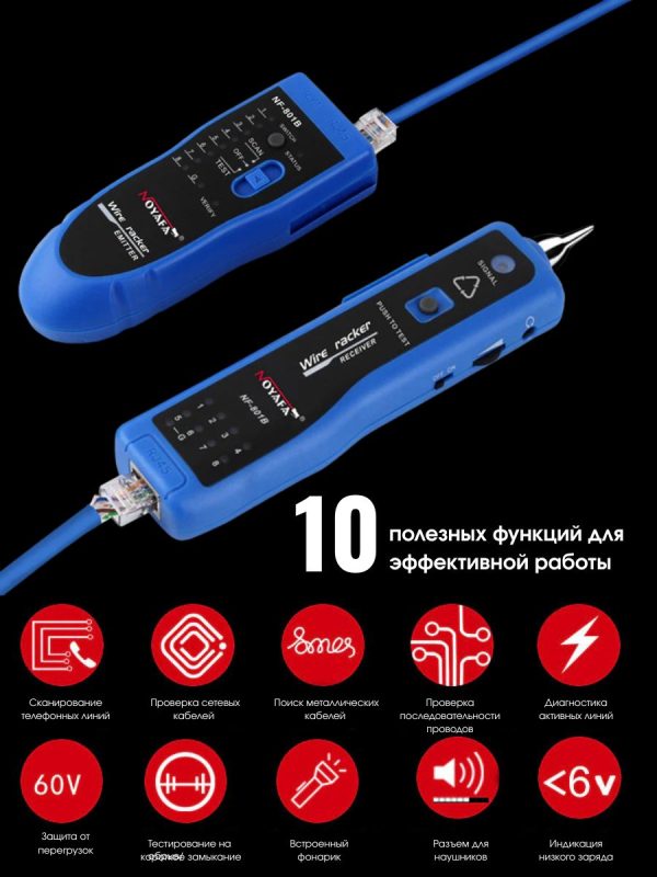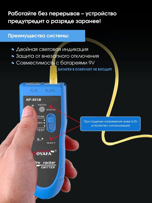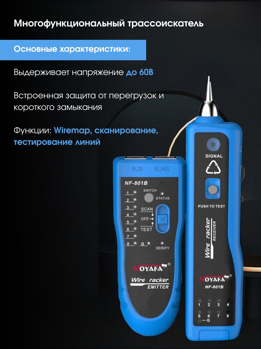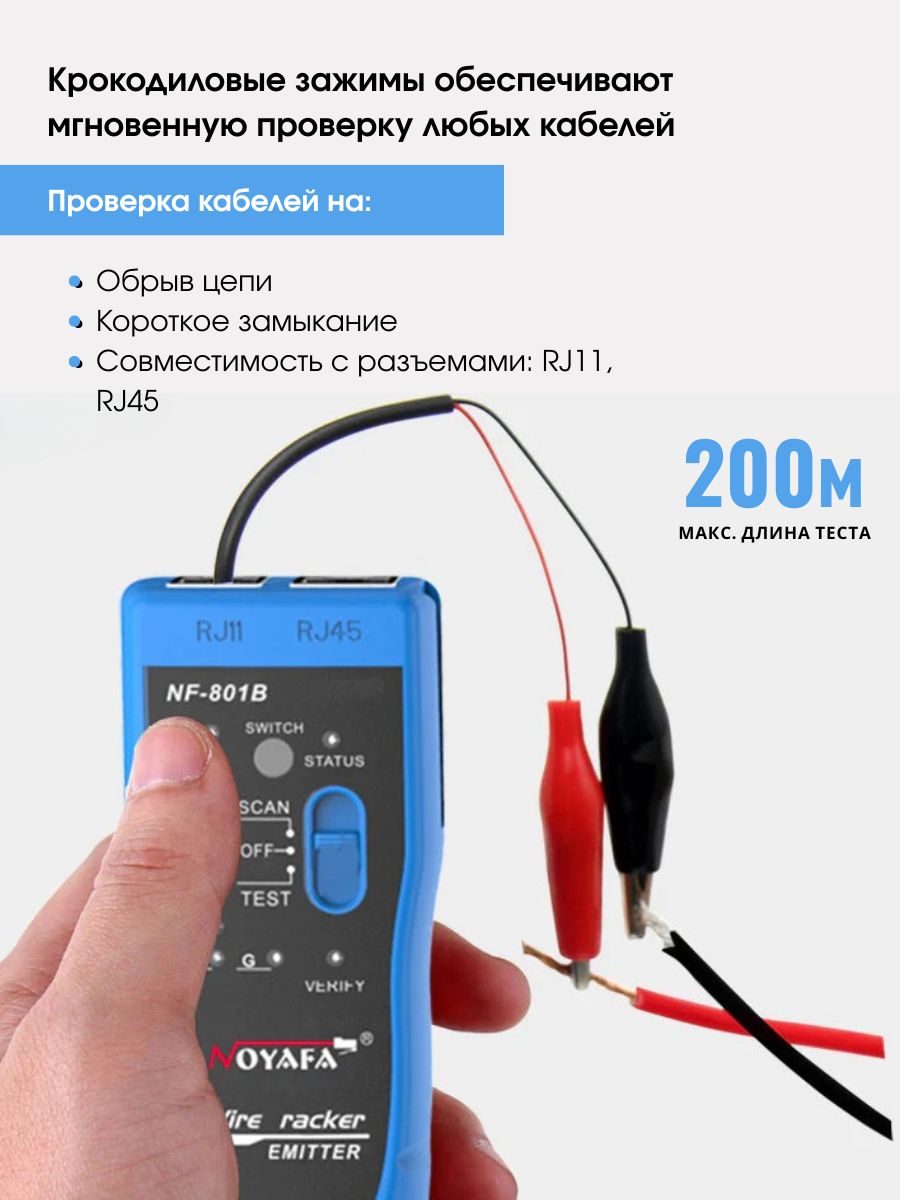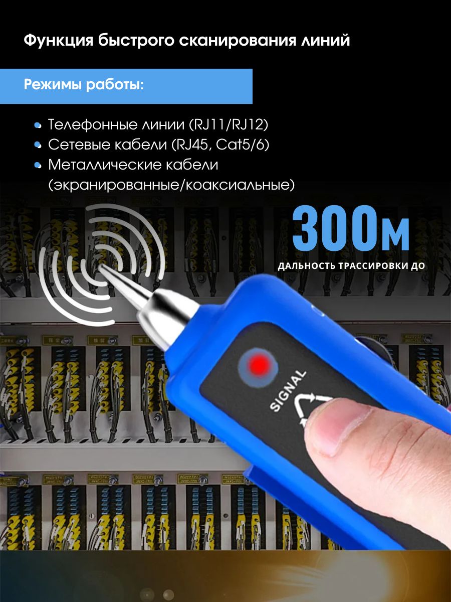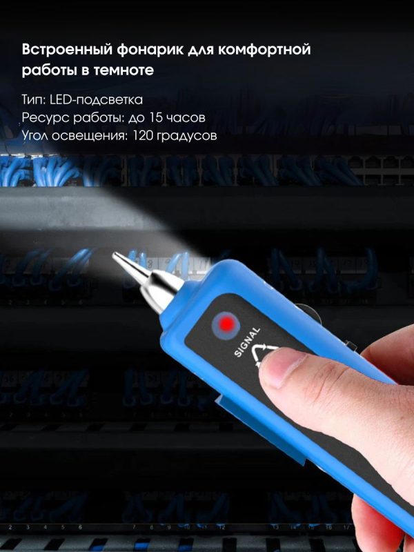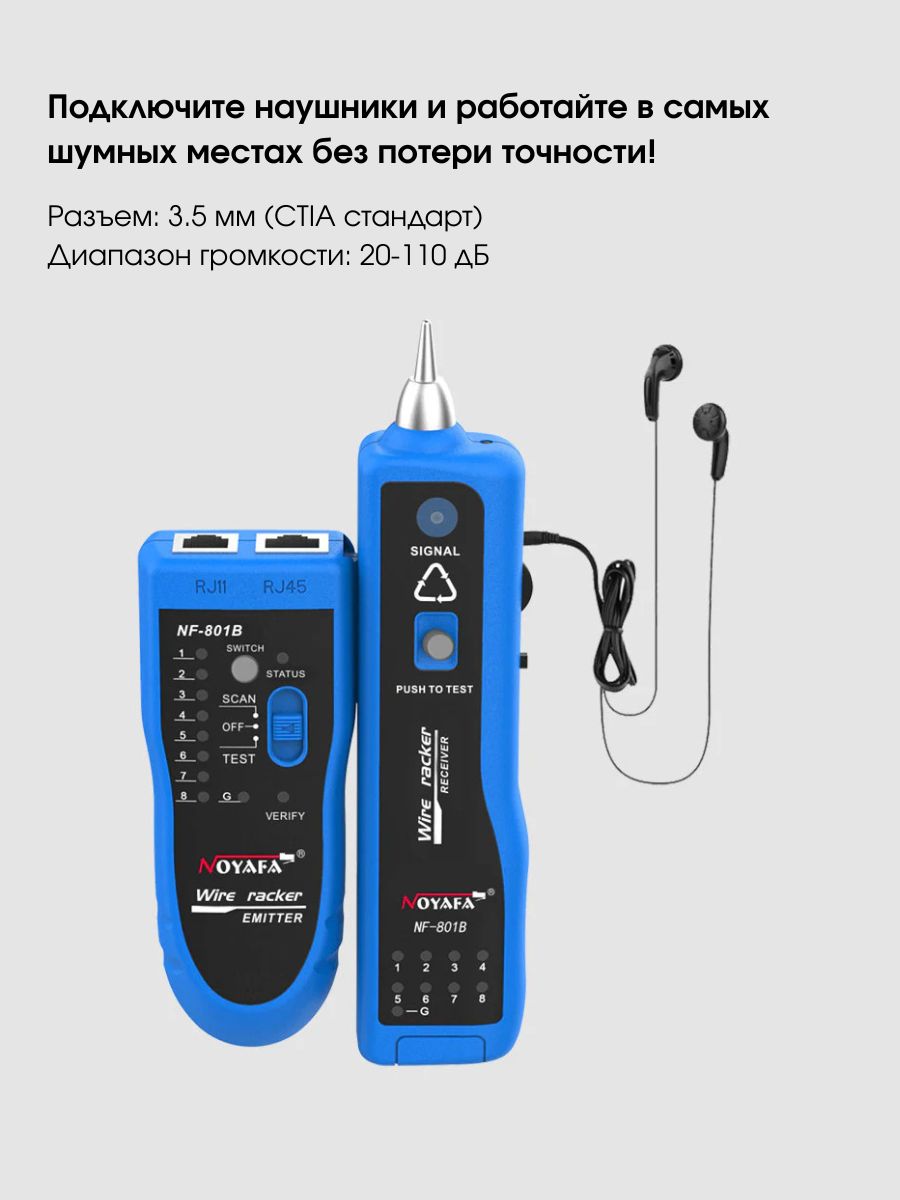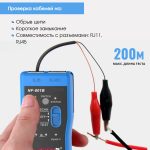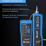 Максимальный рабочий токпередатчик: <10 мА приемник: <30 мА Расстояние передачи сигнала ≤2 км Проверка целостности кабеля — есть Проверка на непрерывность — есть Звуковая индикация — есть Регулировка громкости — есть Тестирование уровня постоянного тока — есть Подключение наушников — есть Общие характеристики Дисплейсветодиодные индикаторы ИнтерфейсRJ-45, RJ-11, Jack 3.5 Источник питания передатчика — батарейка 9 В Габариты передатчика 126 x 49 x 34 мм Габариты приемника 175 x 42 x 27 мм Вес брутто 320 г