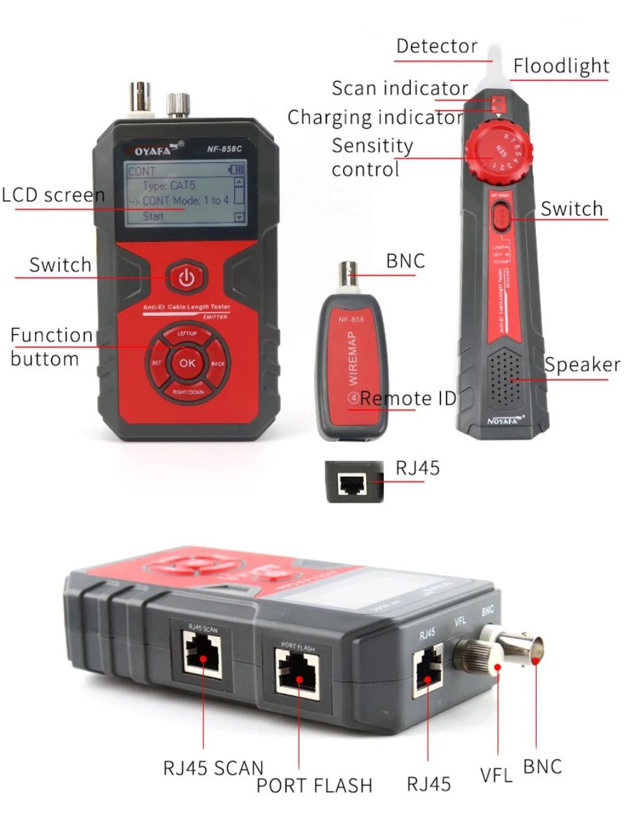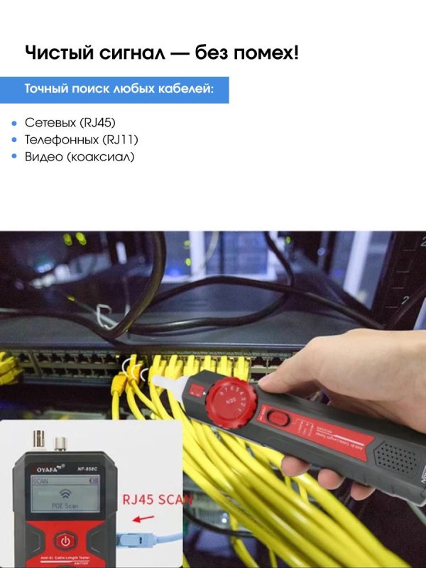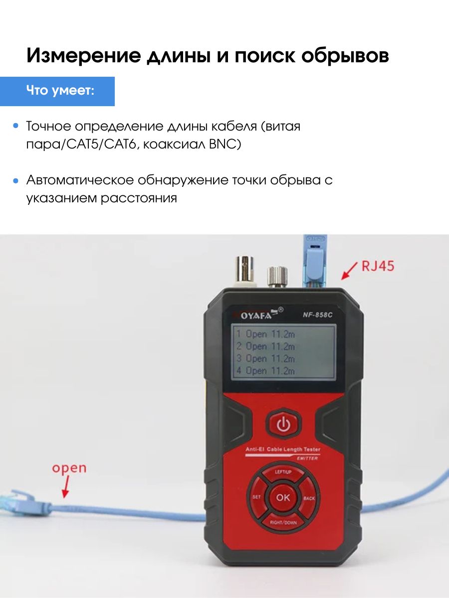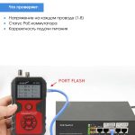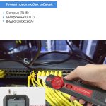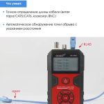 Возможности прозвонка коаксиальных кабелей (BNC) и кабелей из витых пар категории 5 и категории 6 (Cat 5, Cat 6) измерение длины коаксиальных кабелей и кабелей категории 5 и категории 6 до 2000 м трассировка сетевых и коаксиальных кабелей функция проблесковой индикации, позволяющая напрямую находить требуемые кабели, подключенные к сетевому коммутатору с поддержкой питания подключенных устройств по витой паре (PoE) визуализация мест повреждений оптоволоконных кабелей красным светом проверка напряжения на сетевом коммутаторе с поддержкой питания подключенных устройств по витой паре (PoE)