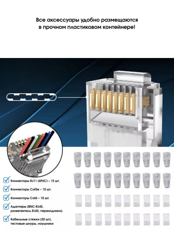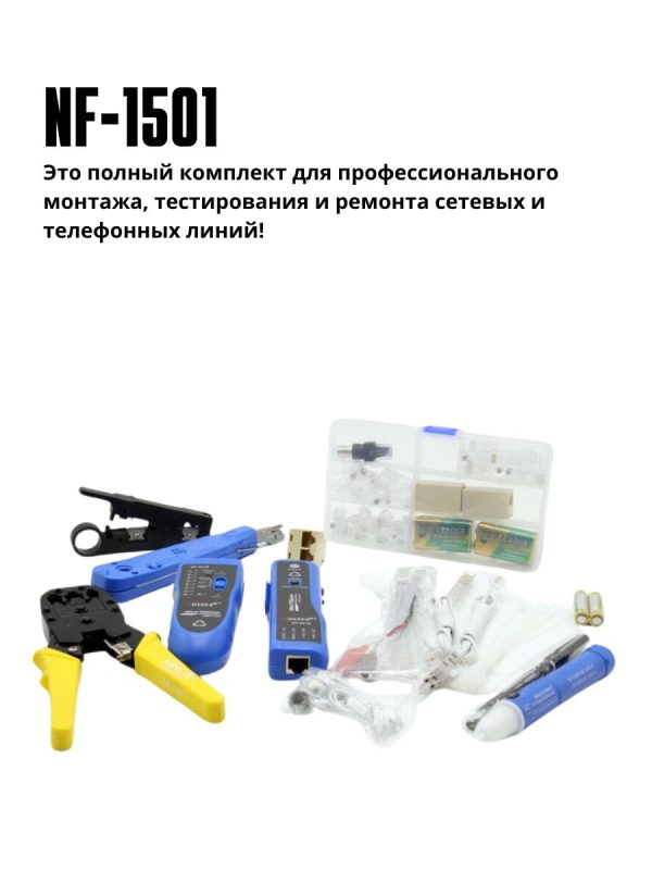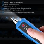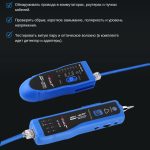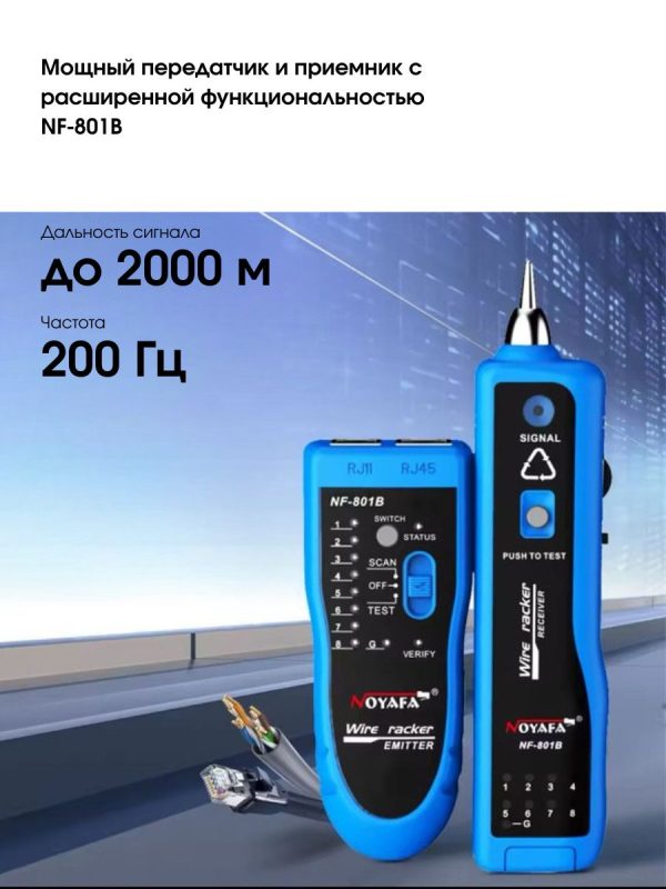 Защита от повышенного напряжения АС < 60 В DC < 42 В Индикация светодиодная и тоновая индикация состояния соединения и ошибок Индикация низкого заряда батареи питания < 6 В Встроенный светодиодный фонарь — есть Регулировка громкости тонового сигнала Автоотключение питания при длительном неиспользовании прибор отключается автоматически Разъемы RJ45, RJ11 Тип батареи питания DC 9 В Характеристики приемника NF-801B Частота генерируемого сигнала 200 кГц Максимальный рабочий ток 30 мА Разъемы — микрофон Тип батареи питания DC 9 В Функцииобнаружение телефонного провода в коммутаторе, витой пары на роутере и в пучке, электрических проводов, функция тестирования витой пары проверка короткого замыкания или обрыва цепи, полярности и индикация уровня постоянного напряжения Общие характеристики Рабочая температура -10°С ~ +50°С Влажность 30 — 90% Вес набора ∼ 1500 г