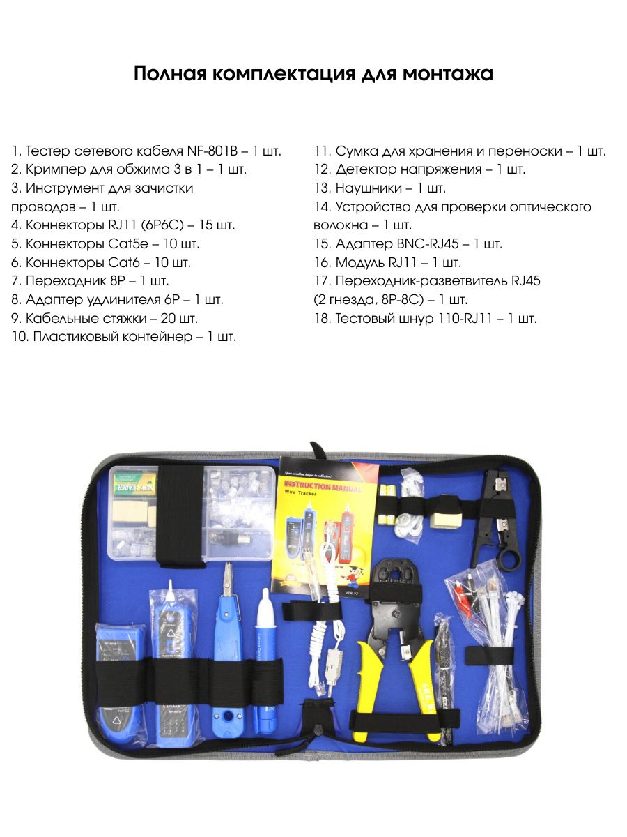 Защита от повышенного напряжения АС < 60 В DC < 42 В Индикация светодиодная и тоновая индикация состояния соединения и ошибок Индикация низкого заряда батареи питания < 6 В Встроенный светодиодный фонарь — есть Регулировка громкости тонового сигнала Автоотключение питания при длительном неиспользовании прибор отключается автоматически Разъемы RJ45, RJ11 Тип батареи питания DC 9 В Характеристики приемника NF-801B Частота генерируемого сигнала 200 кГц Максимальный рабочий ток 30 мА Разъемы — микрофон Тип батареи питания DC 9 В Функцииобнаружение телефонного провода в коммутаторе, витой пары на роутере и в пучке, электрических проводов, функция тестирования витой пары проверка короткого замыкания или обрыва цепи, полярности и индикация уровня постоянного напряжения Общие характеристики Рабочая температура -10°С ~ +50°С Влажность 30 — 90% Вес набора ∼ 1500 г