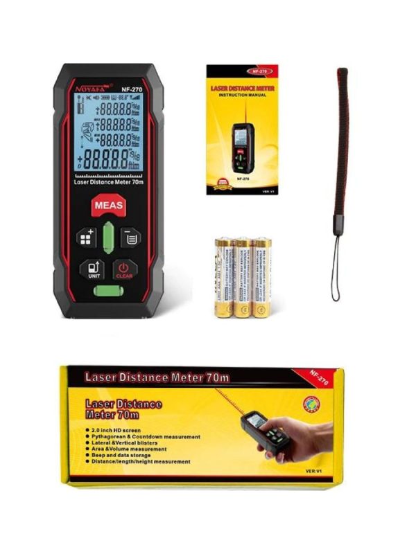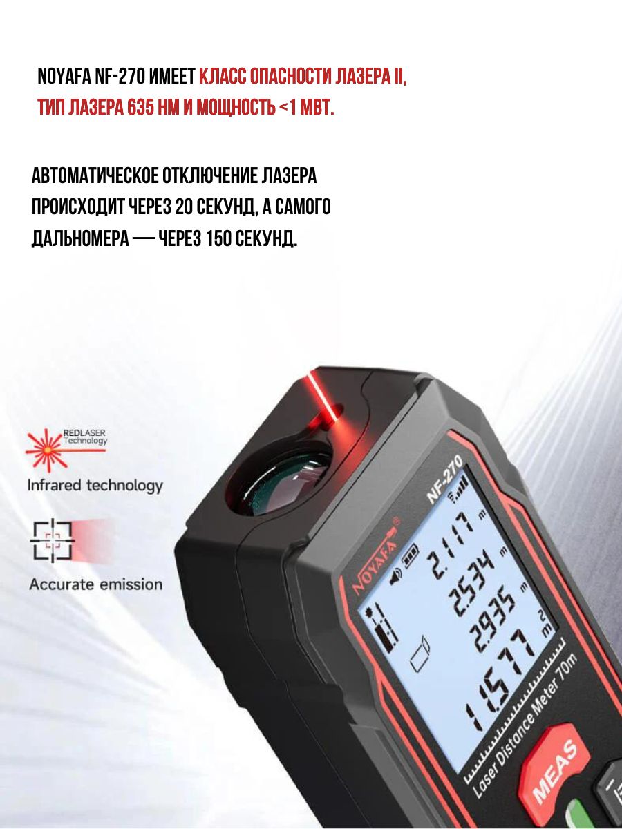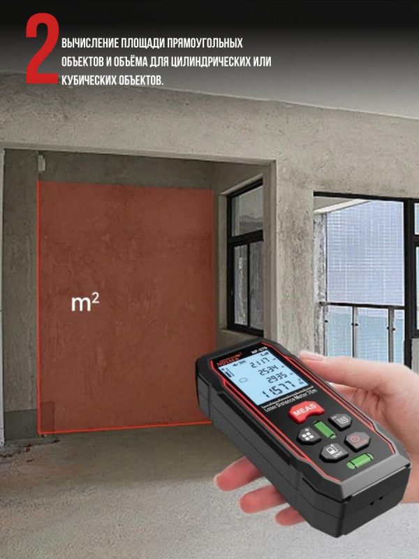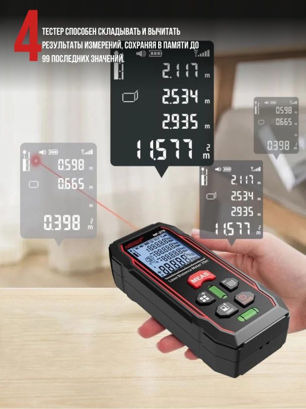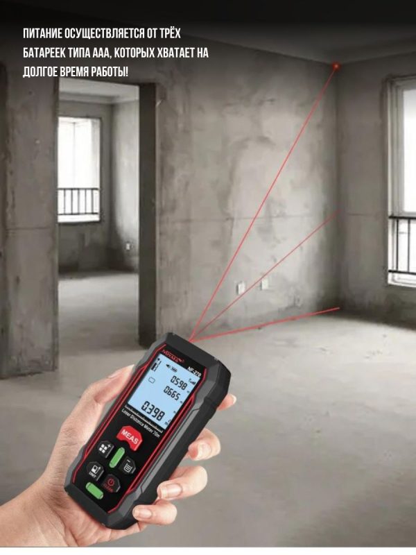 Длина волны и выход: 620-670 нм,<1 мВт Лазерный уровень: класс ll Измерение непрерывности Измерение площади Измерение окружности Измерение площади стены Измерение объема Пифагорейское измерение Обратный отсчет Измерение сложения и вычитания Тип батареи: 3*1,5 батарейки типа АА (не входят в комплект) Размер: 120*52*29 мм