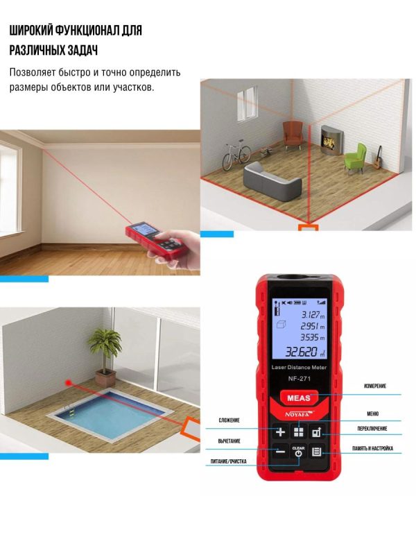 - Измерение с точностью — Одиночное/непрерывное измерение, положительное и отрицательное измерение, а также автоматическое горизонтальное/вертикальное измерение. (точность 50м+-2 мм)
