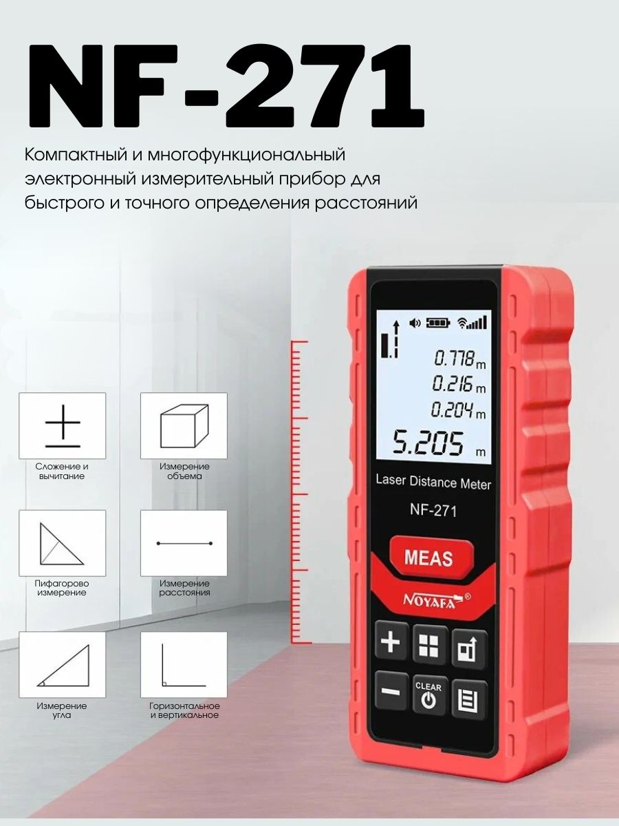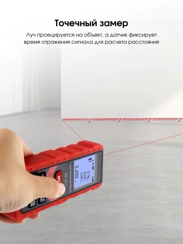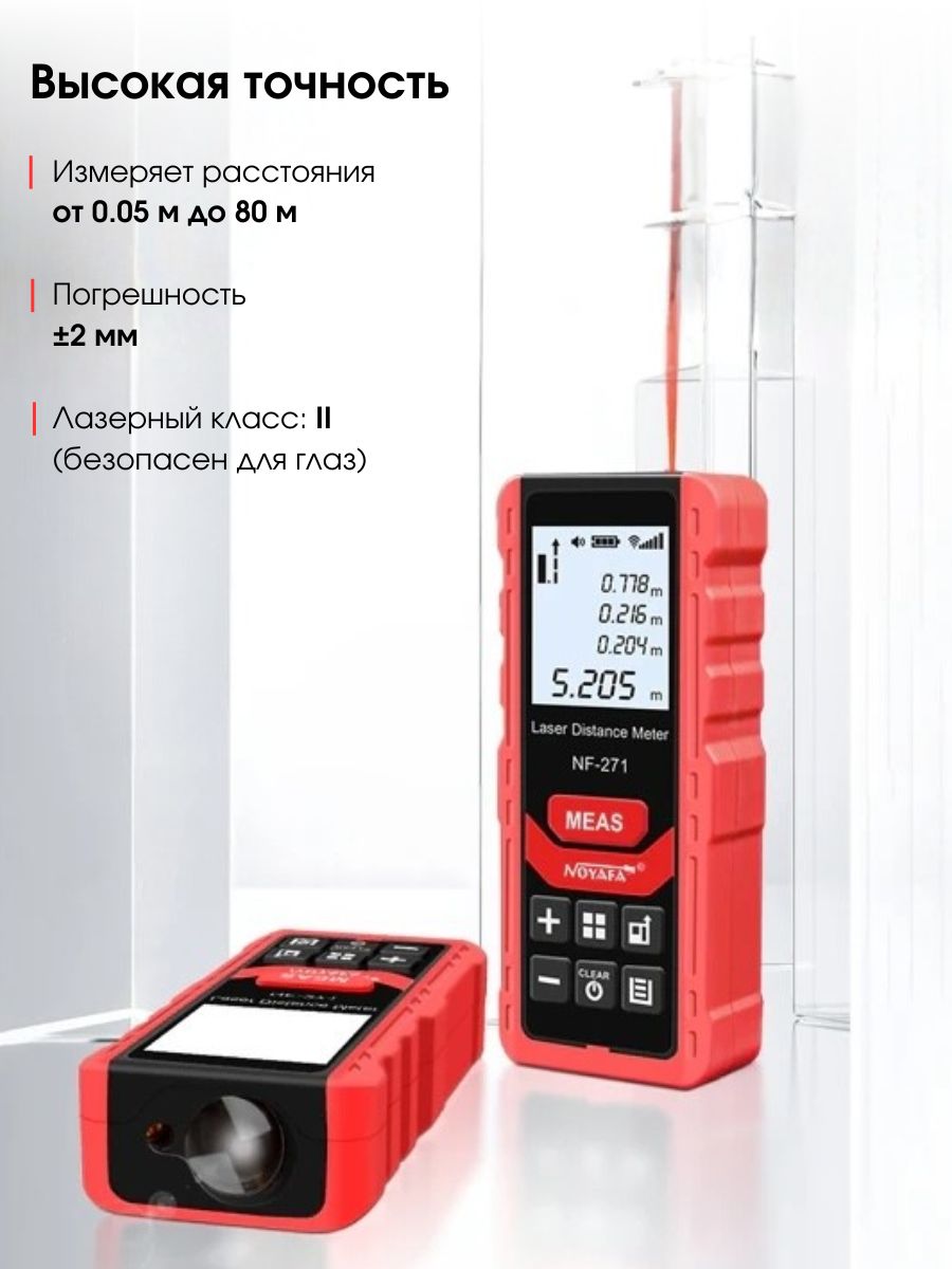 Лазерный измеритель расстояния Noyafa NF-271/80 — эффективный инструмент для точных замеров. Точность измерений составляет ± 2мм. Дальность действия достигает 80 метров, что подходит для работы как в помещениях, так и на улице. Имеется возможность непрерывного измерения, одиночного замера, а также расчета площади и объема. Измеритель позволяет выполнять косвенные замеры по формуле Пифагора, что упрощает работу с труднодоступными местами.