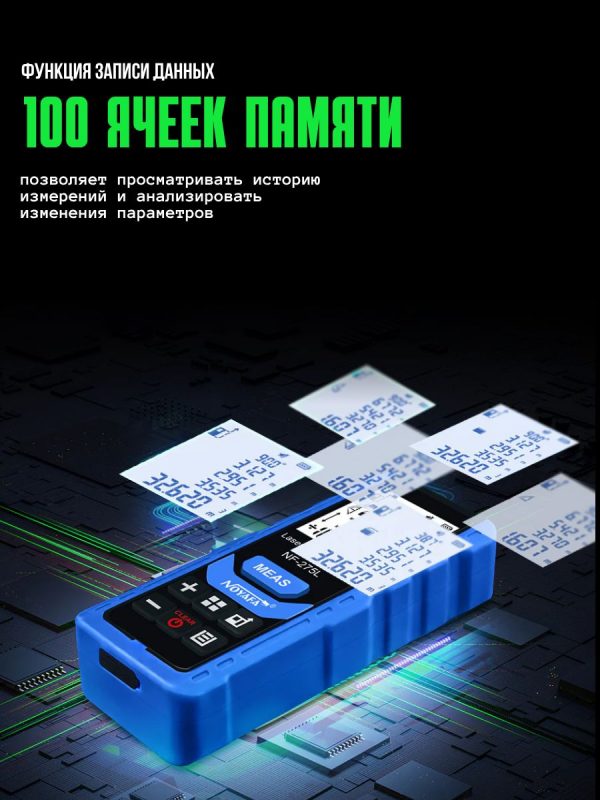 Эргономичный дизайн, крепкий корпус, небольшие габариты и вес прибора обеспечивают удобное использование в полевых и промышленных условиях. Лазерная рулетка NF-275L-100M оснащена мощным зеленым лазером, что обеспечивает лучшую стабильность и надежность измерений по сравнению с традиционными красными лазерами, большим многострочным ЖК-дисплеем с яркой подсветкой, внутренней памятью на 99 результатов измерения, mini USB-разъемом для зарядки батареи, голосовым озвучением результатов измерения, цифровым уровнем и вместительной литиевой аккумуляторной батареей 3,7 В, 750 мАч.