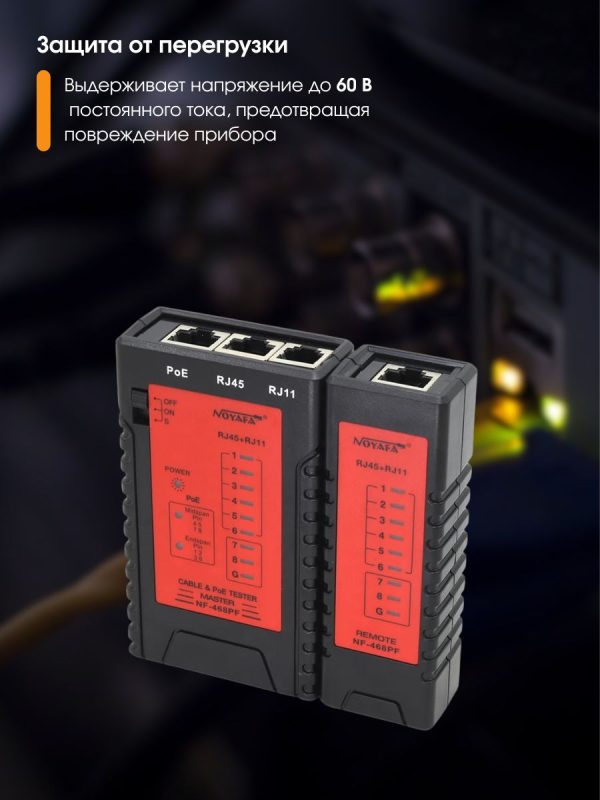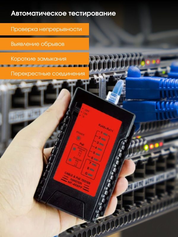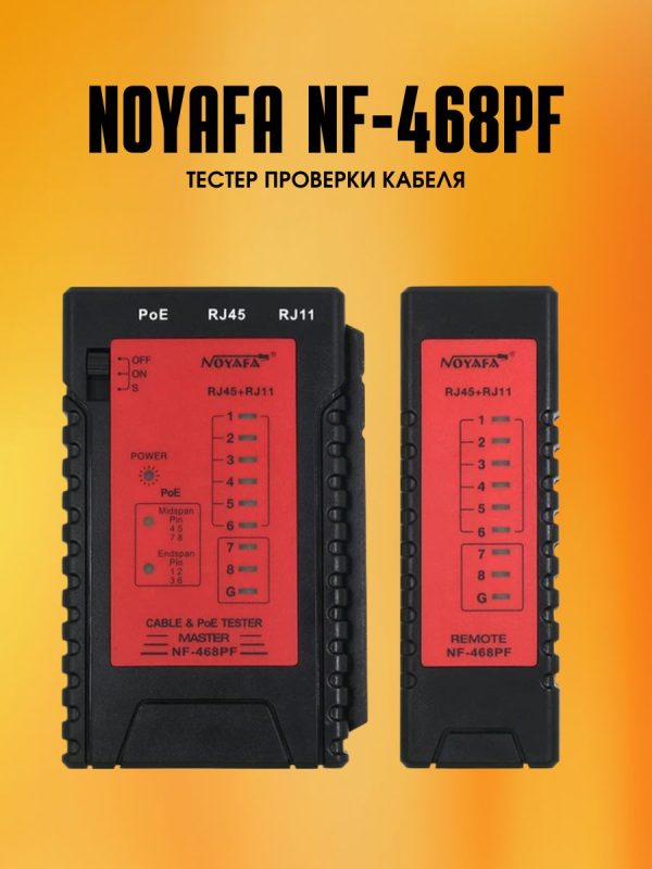 NF-468PF — это многофункциональный кабельный тестер, который объединяет несколько типов тестирования кабеля и тестирования POE. Он может проверить состояние кабеля: наличие непрерывных, разомкнутых, закороченных и скрещенных пар проводов для коннекторов RJ45, RJ11 и RJ12.