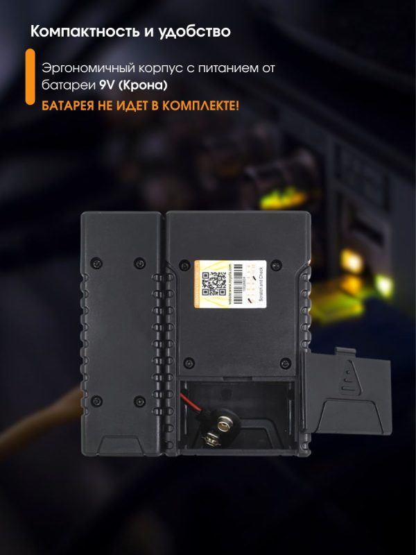 - Питание: батарея — 1 шт. х 9 В тип Крона (в комплект не входит).