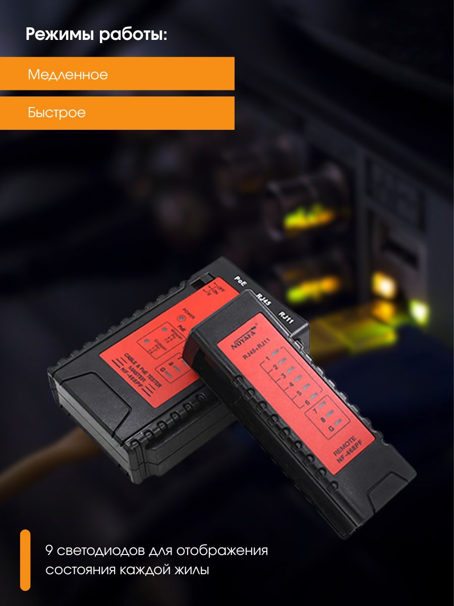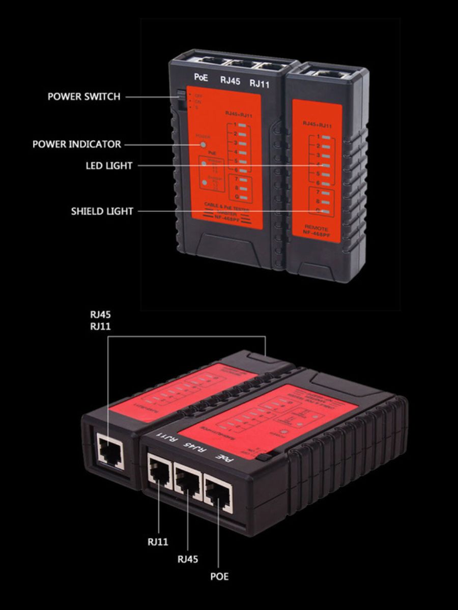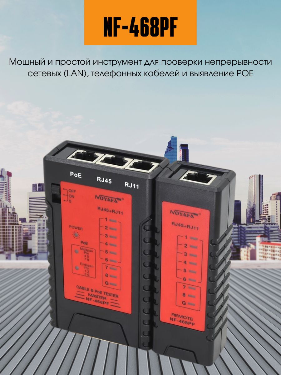NF-468PF — это многофункциональный кабельный тестер, который объединяет несколько типов тестирования кабеля и тестирования POE. Он может проверить состояние кабеля: наличие непрерывных, разомкнутых, закороченных и скрещенных пар проводов для коннекторов RJ45, RJ11 и RJ12.