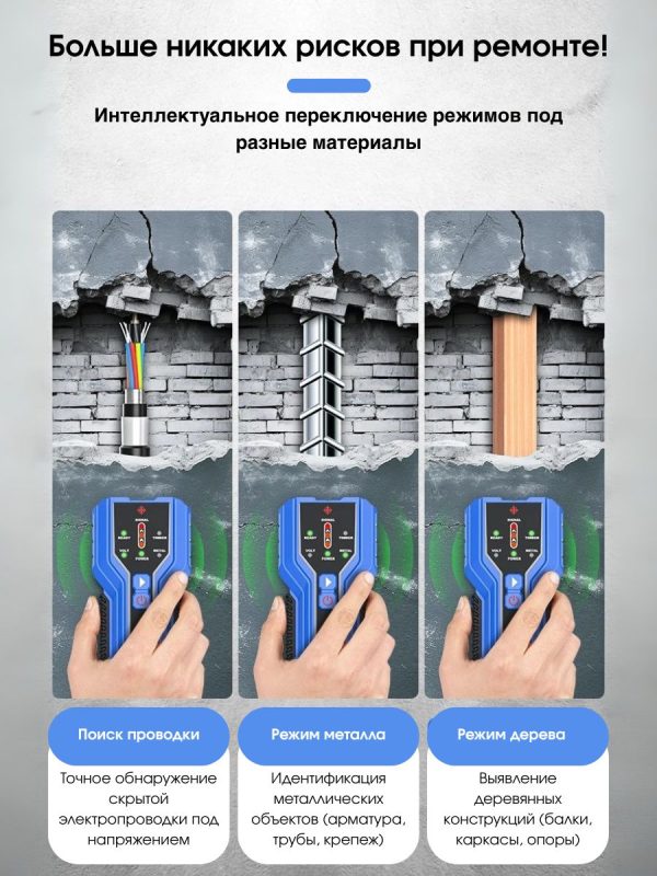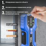- Три режима обнаружения: металл, дерево и переменный ток — для разных задач и типов поверхностей