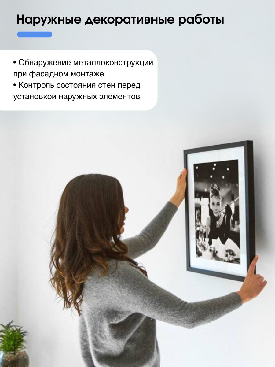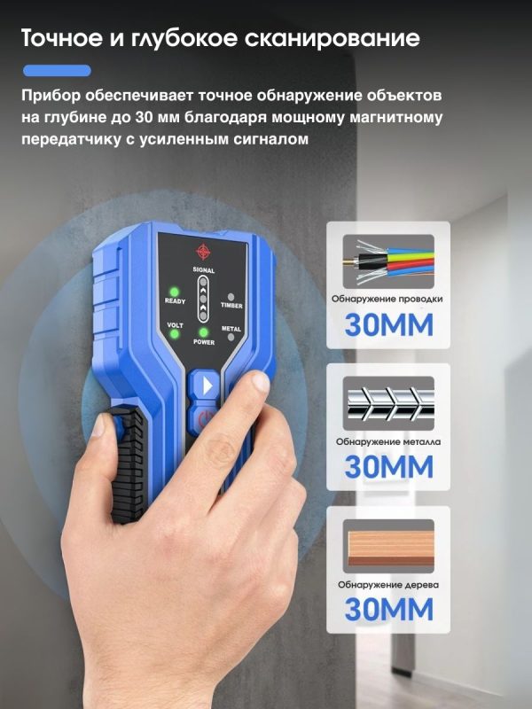 - Глубина обнаружения до ~30 мм для большинства материалов