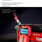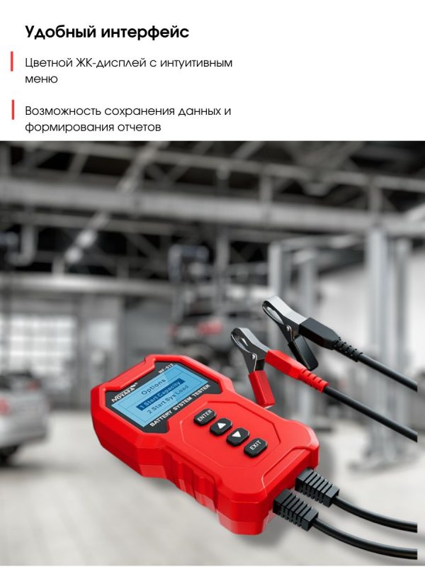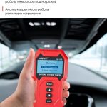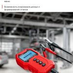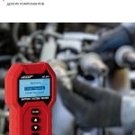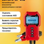 Информация представлена на цифровом экране. Устройство также включает тесты для оценки срока службы батареи, проверки запуска двигателя и анализа работы системы зарядки. Номинальная мощность составляет 0,72 Вт, а пиковая — 16,8 Вт.