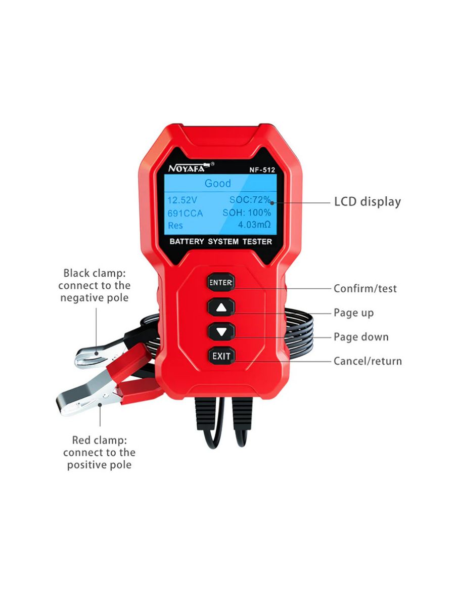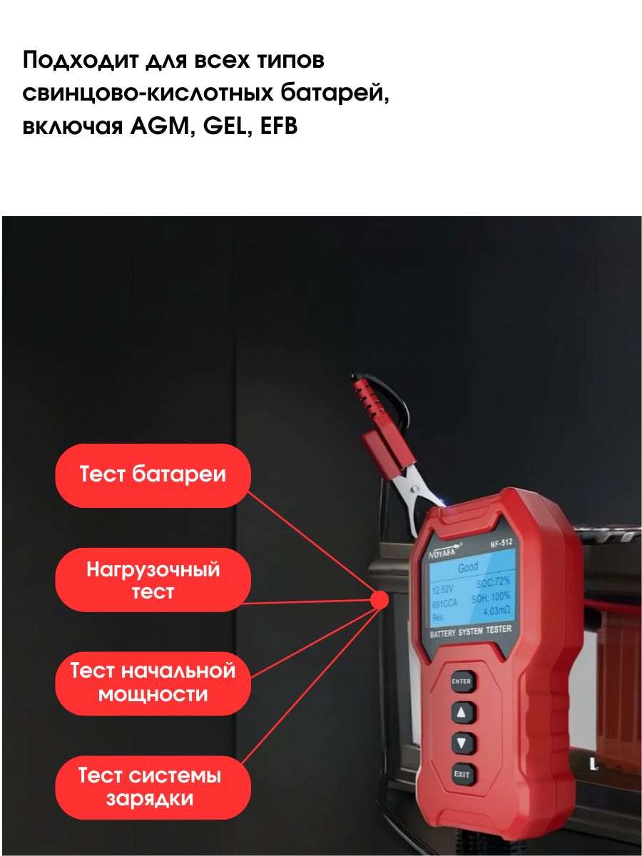 Тестер аккумулятора Noyafa NF-512 — это высокоэффективный акб тестер, созданный для всесторонней диагностики разных типов аккумуляторов, таких как свинцово-кислотные, литиевые и никель-металлогидридные. Устройство позволяет одновременно тестировать до четырех аккумуляторов, что значительно ускоряет процесс проверки. Диапазон измерения емкости варьируется от 5 до 200 Ач, в то время как сопротивление может определяться в пределах от 0 до 99 МОм.