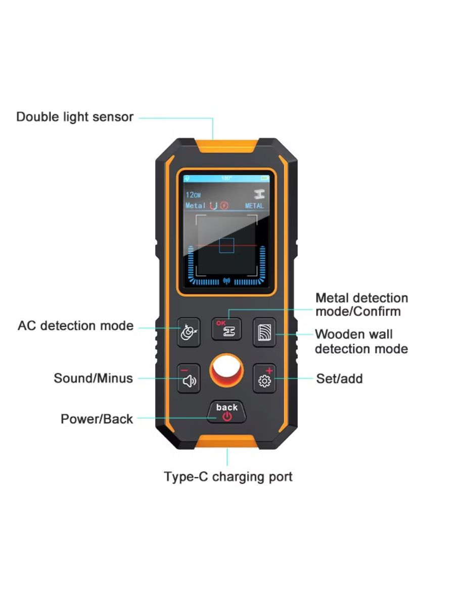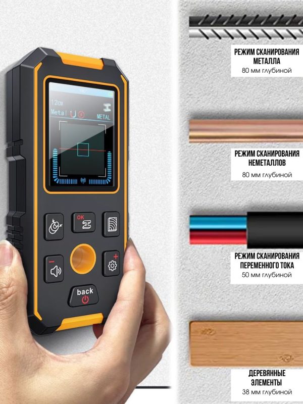 Прибор NF-513 позволяет эффективно обнаруживать как магнитные, так и немагнитные металлы, деревянные конструкции, кабели под напряжением и другие объекты за стенами, потолками и полами.