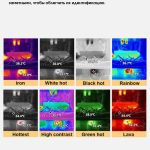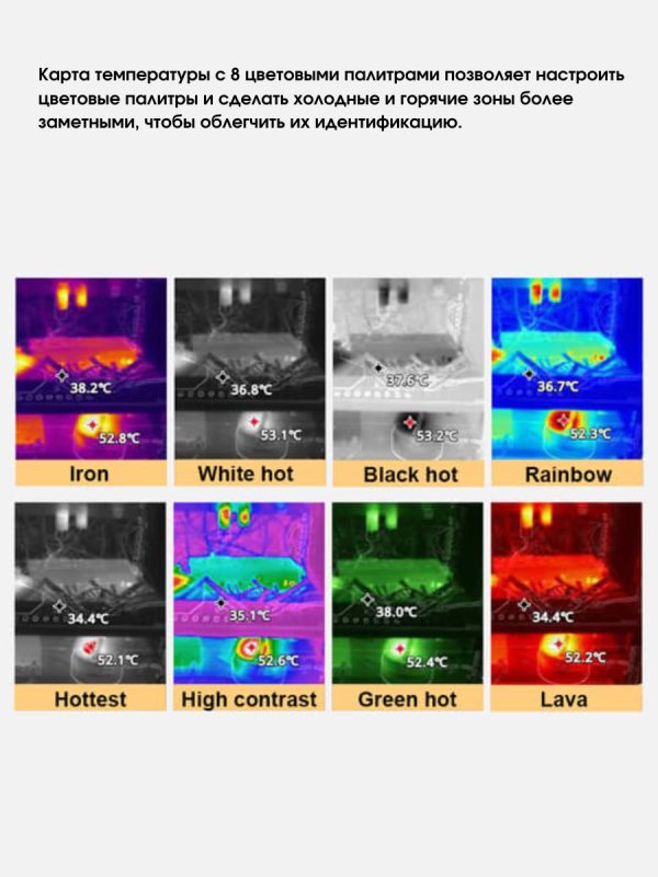 Для визуализации доступны различные цветовые палитры, включая «железный красный», «радужный», «красный горячий», «чёрный горячий», «белый горячий», «высококонтрастный», «зелёный горячий» и «лава».