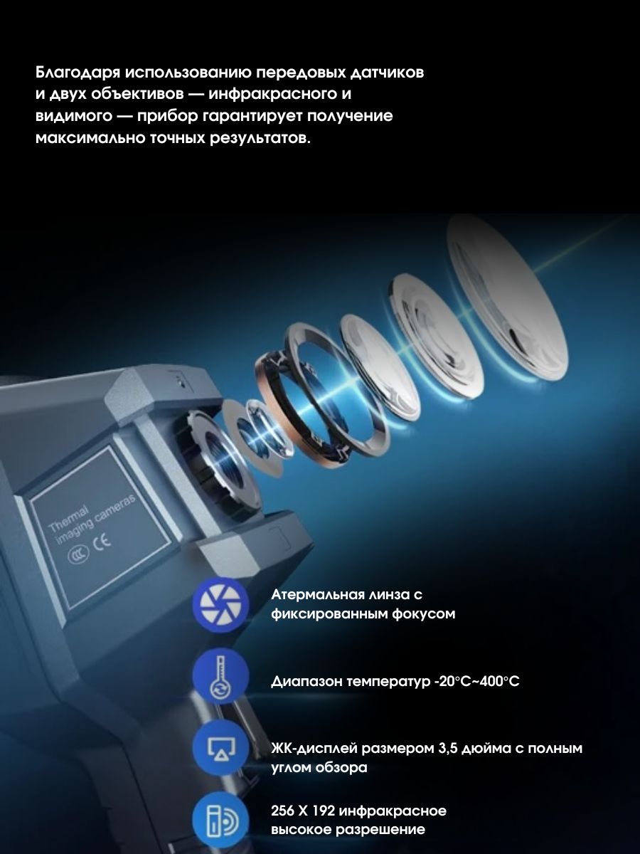 Разрешение изображения в видимом диапазоне — 720p, поле зрения составляет 55° × 83°. Встроенная память объёмом 8 ГБ позволяет сохранять термограммы и видеозаписи без подключения к внешним устройствам. Изображения сохраняются в формате JPG, видео — в формате MP4.