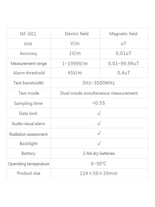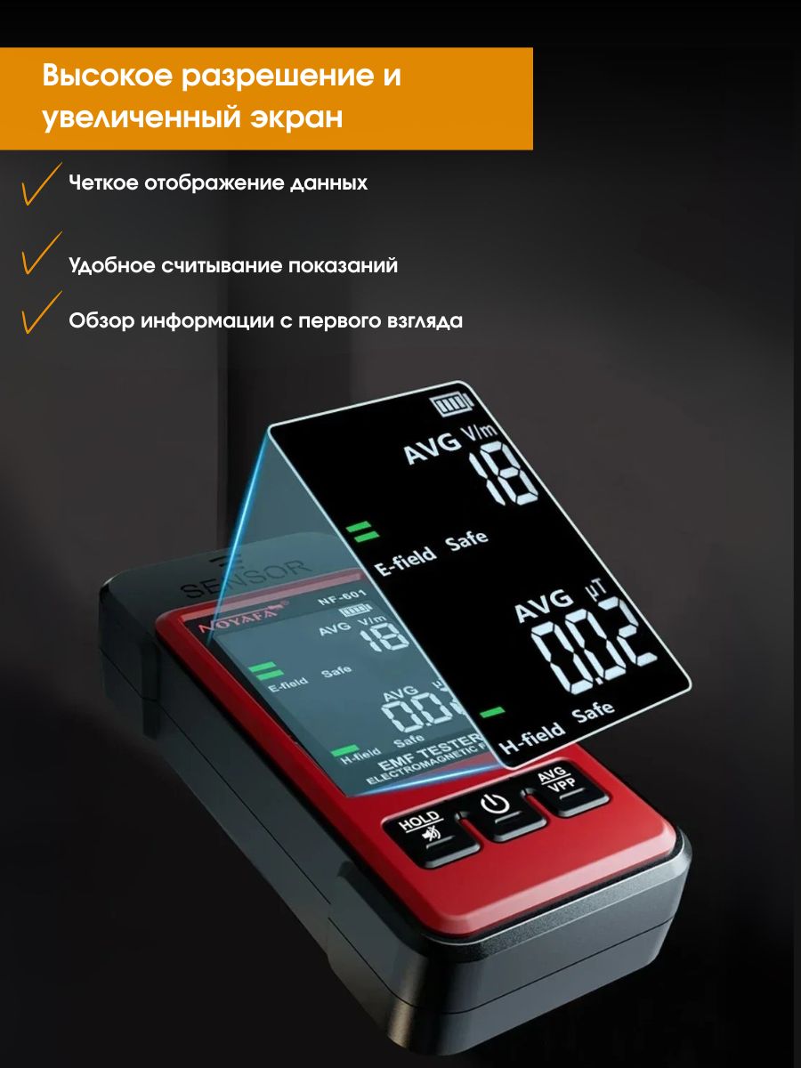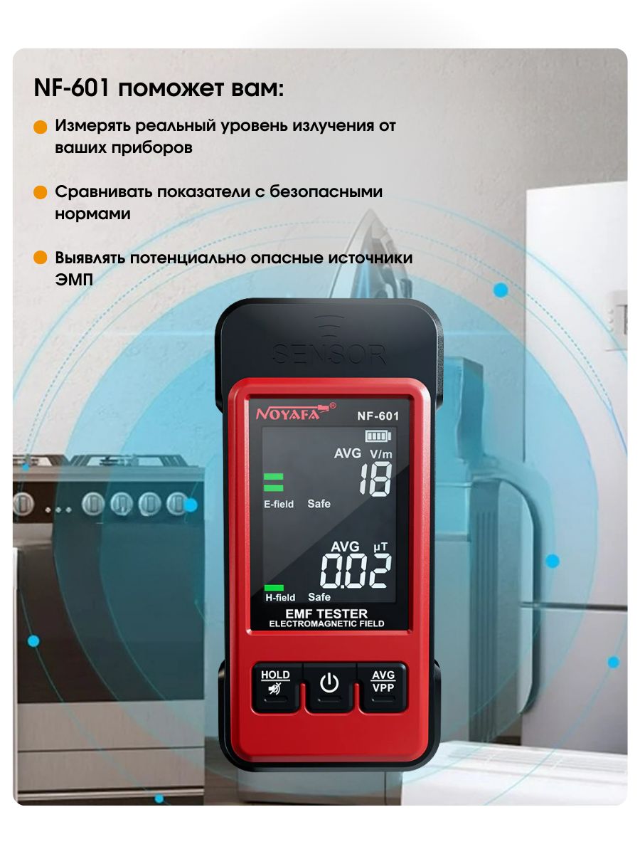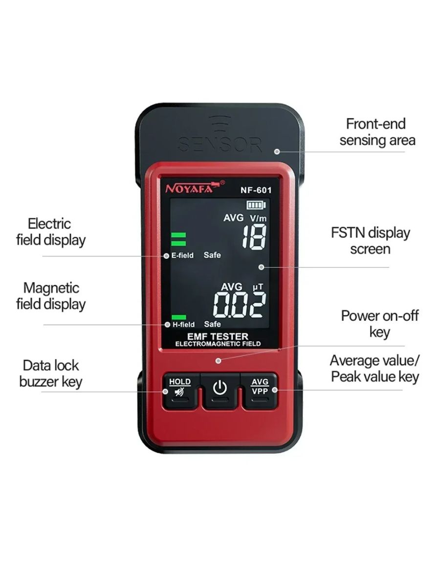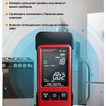 Время выборки < 0,5 с Дополнительные функции Удержание данных — есть Аудио и световая индикация — есть Измерение радиации — есть Подсветка — есть Измерение в реальном времени — есть Индикация заряда батареи — есть Среднее значение — есть Общие характеристики Дисплей — цифровой ЖК-экран Источник питания — батарейки типа «АА» х 2 Рабочая температура 0 — 50 ℃ Габариты изделия — 124 х 59 х 29 мм Габариты упаковки 180 х 90 х 40 мм Вес брутто 307 г Комплектация Измеритель электромагнитного поля Noyafa NF-601 – 1 шт; сертификат соответствия — 1 шт; руководство пользователя — 1 шт