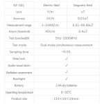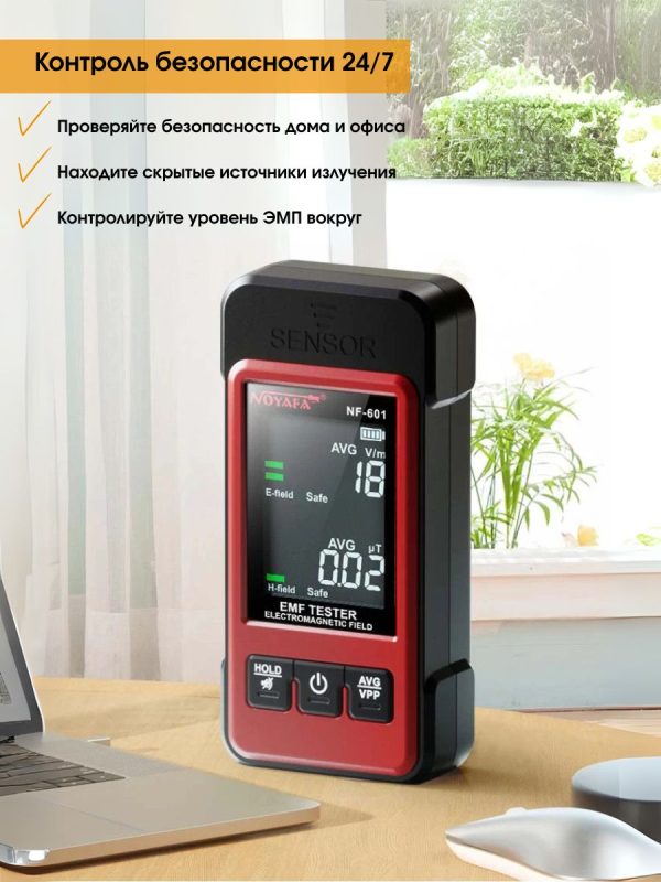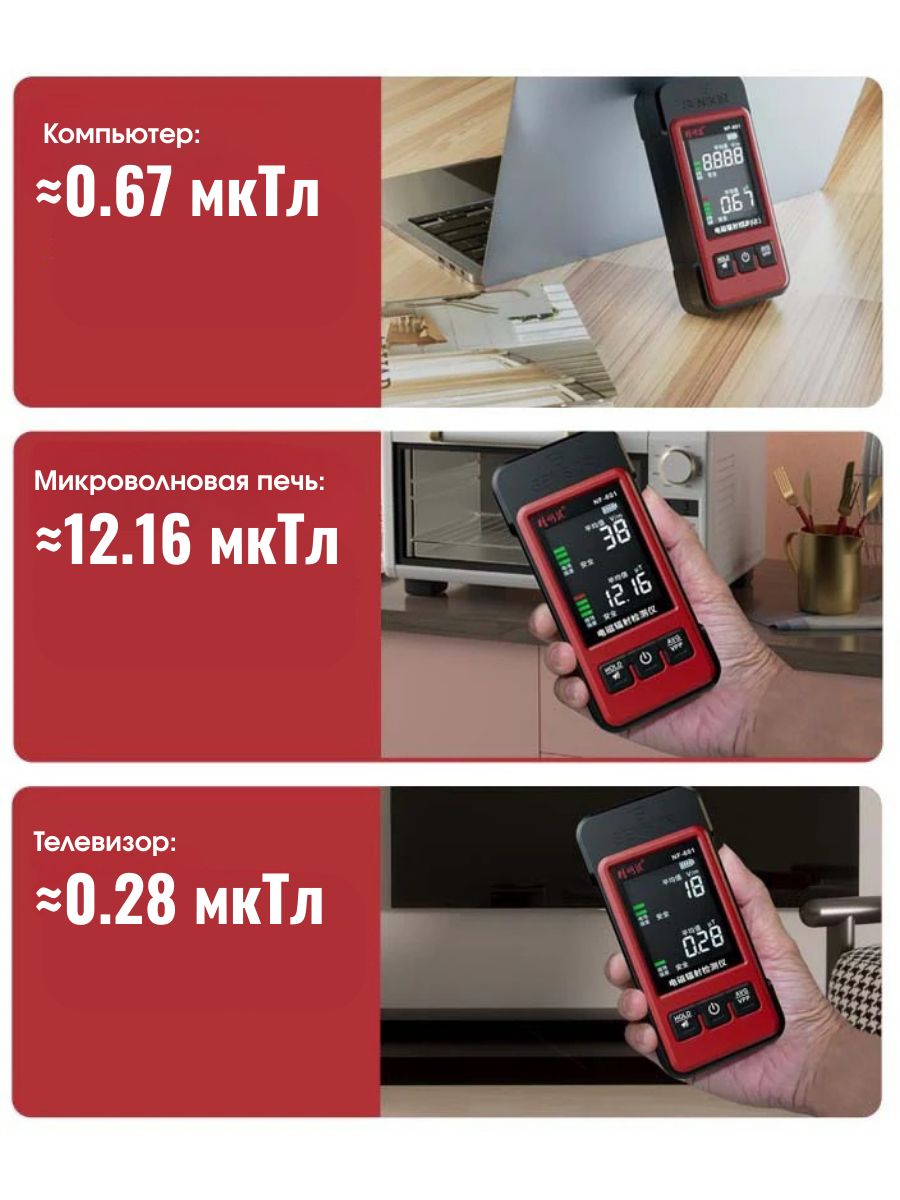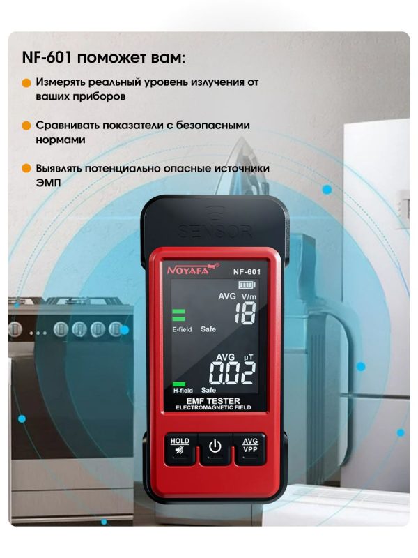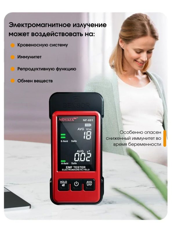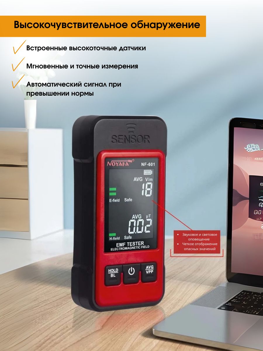 Время выборки < 0,5 с Дополнительные функции Удержание данных — есть Аудио и световая индикация — есть Измерение радиации — есть Подсветка — есть Измерение в реальном времени — есть Индикация заряда батареи — есть Среднее значение — есть Общие характеристики Дисплей — цифровой ЖК-экран Источник питания — батарейки типа «АА» х 2 Рабочая температура 0 — 50 ℃ Габариты изделия — 124 х 59 х 29 мм Габариты упаковки 180 х 90 х 40 мм Вес брутто 307 г Комплектация Измеритель электромагнитного поля Noyafa NF-601 – 1 шт; сертификат соответствия — 1 шт; руководство пользователя — 1 шт