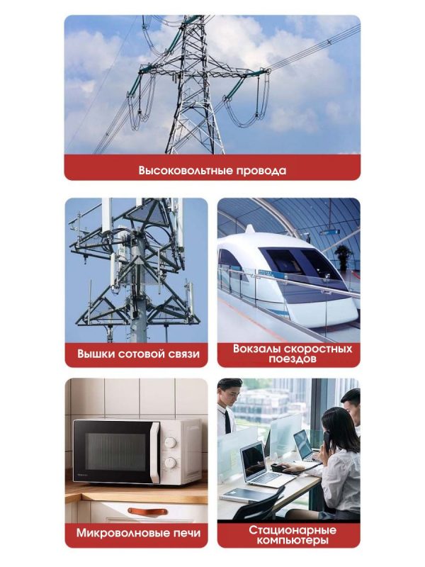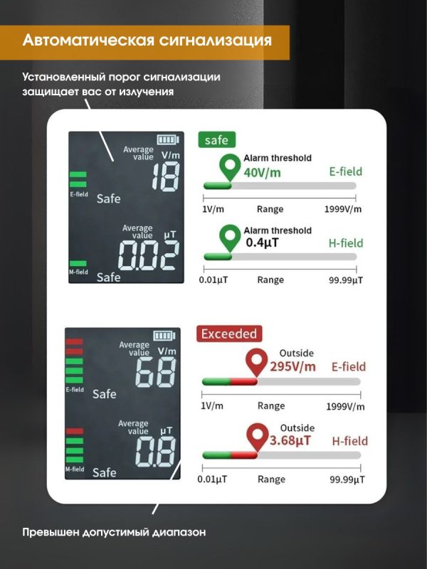 Порог сигнализации 45 В / м (электрическое поле) / 0,4 мкТл (магнитное поле)
