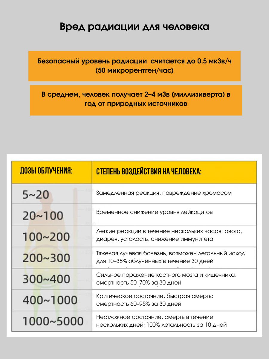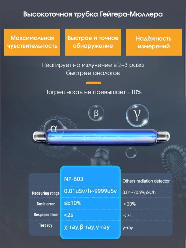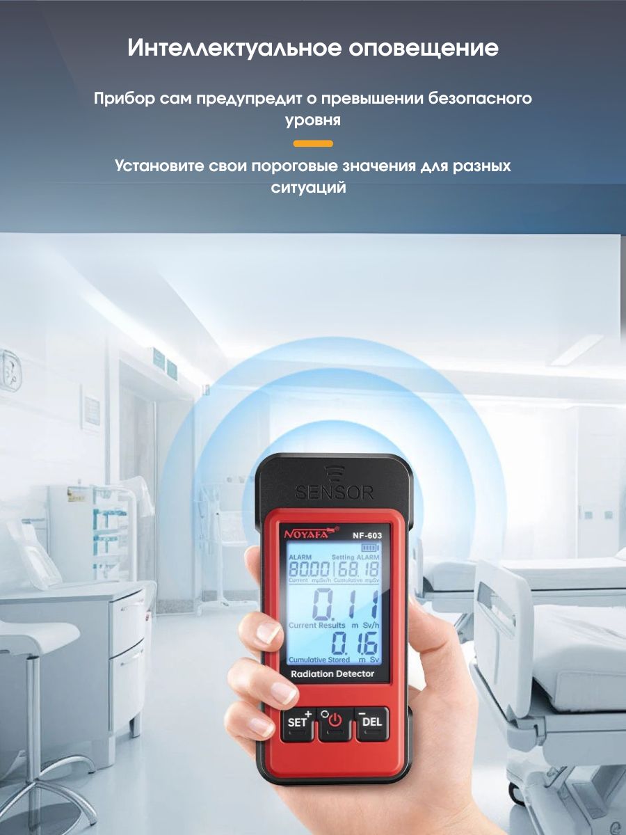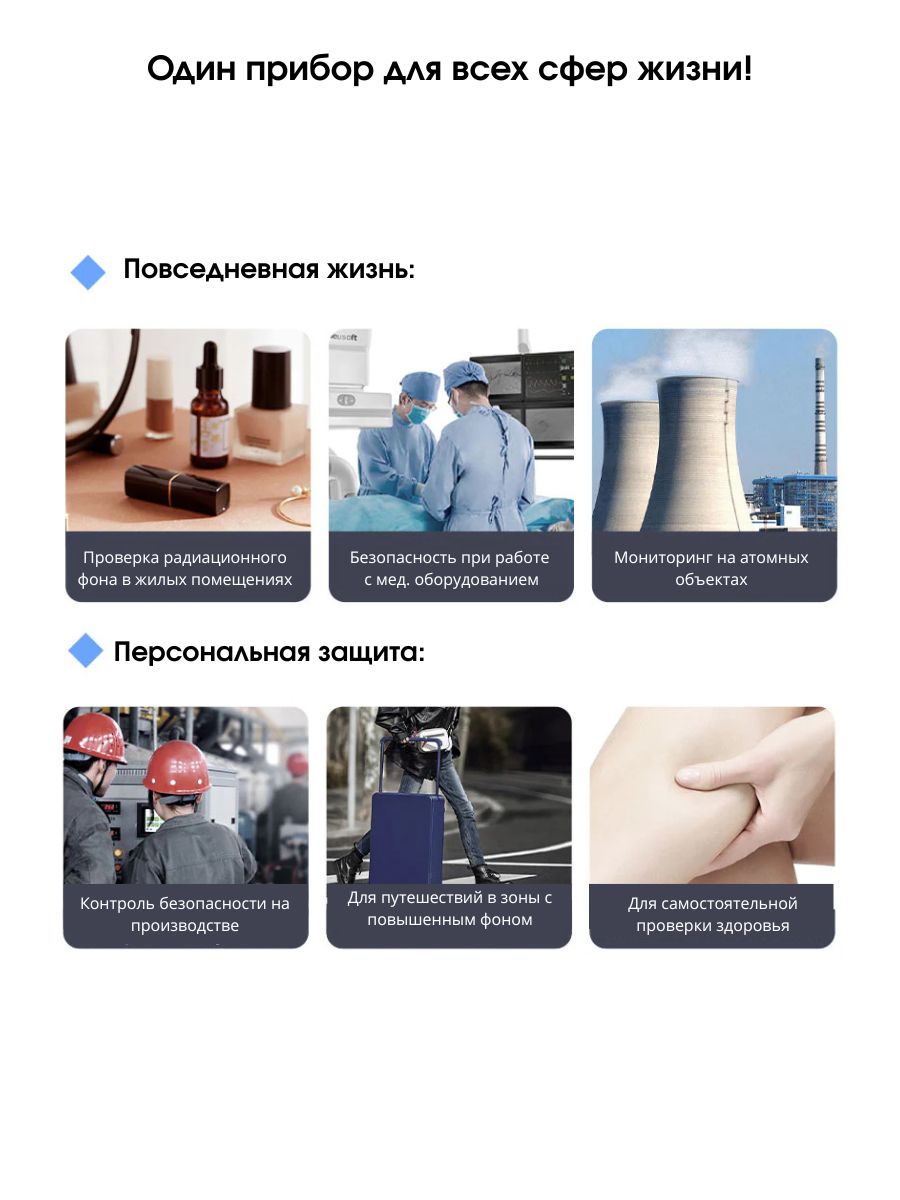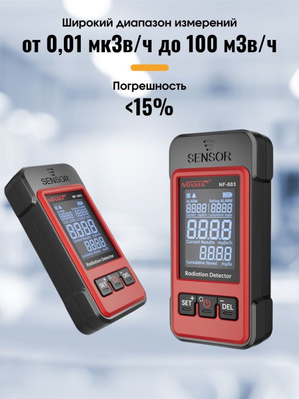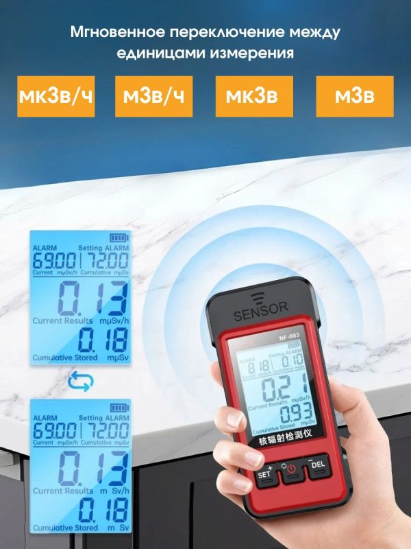 Широкий диапазон измерений — измеряет от 0,01 мкЗв/ч до 100 мкЗв/ч с относительной погрешностью <15% и накапливает дозы до 500 мЗв. Быстрый отклик и дисплей в реальном времени — обновляется каждую секунду с временем отклика <2 секунд, оснащен интуитивно понятным дисплеем с подсветкой. Регулируемая звуковая сигнализация — поддерживает автоматический мониторинг с регулируемыми порогами сигнализации мощности дозы для повышения безопасности. Гибкое переключение единиц измерения — легкое переключение между единицами измерения (мЗв/ч, мЗв/ч, мЗв, мЗв) и отображение значений накопленной дозы. Удобный и портативный — компактный дизайн с функциями автоотключения и подсветки для экономии заряда батареи (2 батареи AA). Долговечность — работает при температурах от -20°C до +55°C, подходит для различных условий и применений.