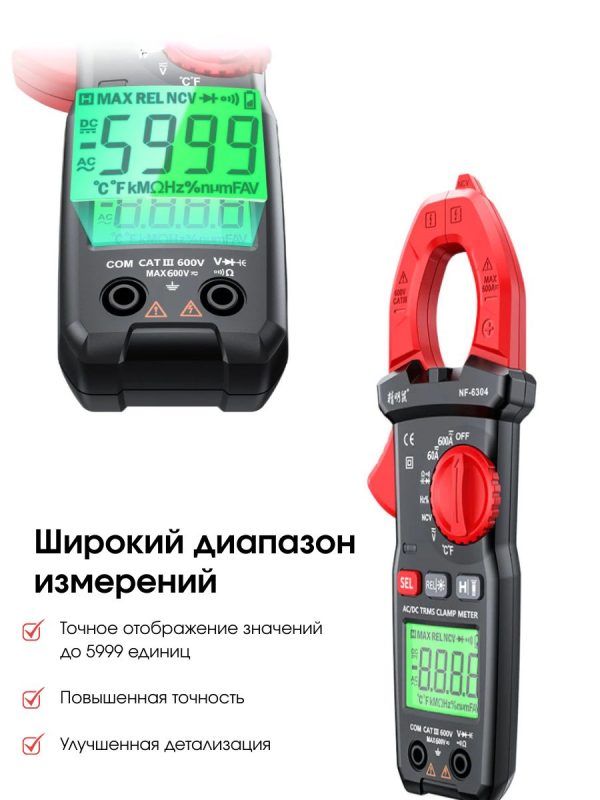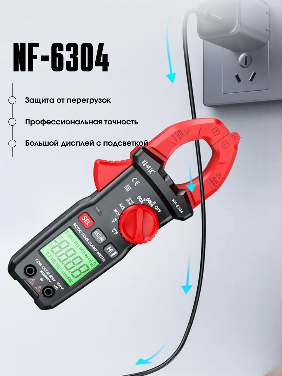 Цифровой мультиметр NF-6304 — это универсальный измерительный прибор, предназначенный для точного измерения различных электрических параметров. Устройство поддерживает измерение переменного и постоянного напряжения, тока, сопротивления, ёмкости, частоты, температуры, а также проверку диодов и целостности цепи. NF-6304 оснащён большим ЖК-дисплеем с подсветкой для удобства чтения данных и встроенной защитой от перегрузки. Идеально подходит как для профессионального использования, так и для домашних мастеров.