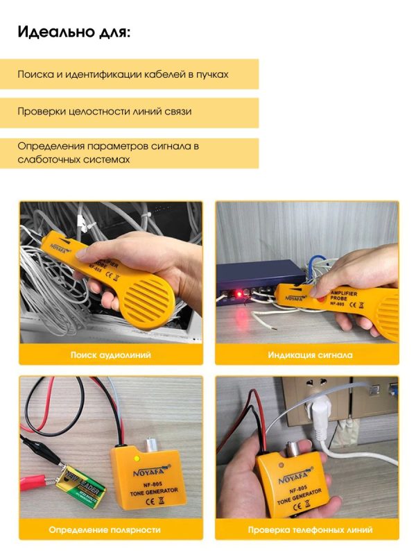 Максимальный рабочий ток передатчика <20 мА Максимальный рабочий ток приемника <70 мА Расстояние передачи сигнала≤1,5 км Проверка целостности кабеляесть Трассировка кабеляесть Проверка на наличие обрываесть Звуковая индикацияесть Регулировка громкости — есть Подключение наушников — есть Защита от перенапряжения 48 В Общие характеристики Дисплей — светодиодные индикаторы Интерфейс RJ-11, Jack 3.5, «крокодил» Источник питания передатчика — батарейка 9 В Габариты передатчика 65 x 58 x 34 мм Габариты приемника230 x 56 x 25 мм Вес 213 г