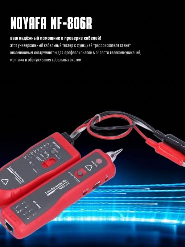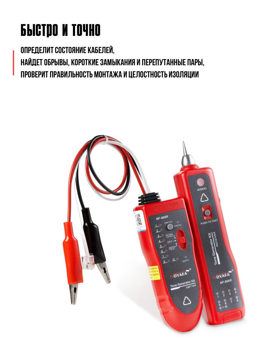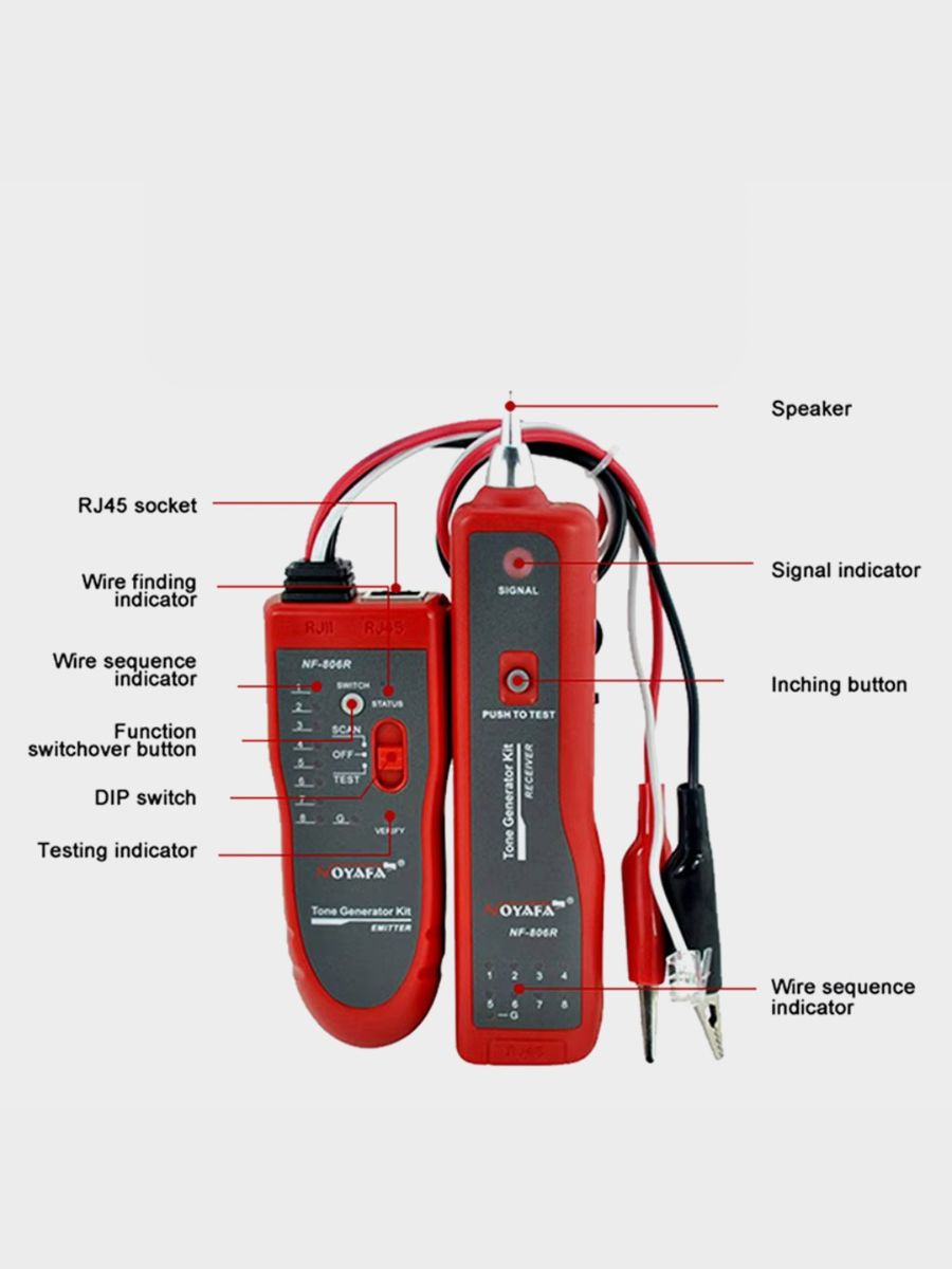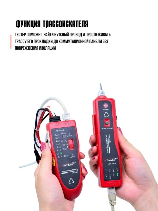 Измерительный прибор 2 в 1 Noyafa NF-806R предназначен для обнаружения подземных электрических коммуникаций, проверки телефонной линии. Используется в ходе проведения ремонтных работ для обнаружения повреждений, таких как, наличие короткого замыкания, обрыв цепи, проверка полярности постоянного напряжения.
