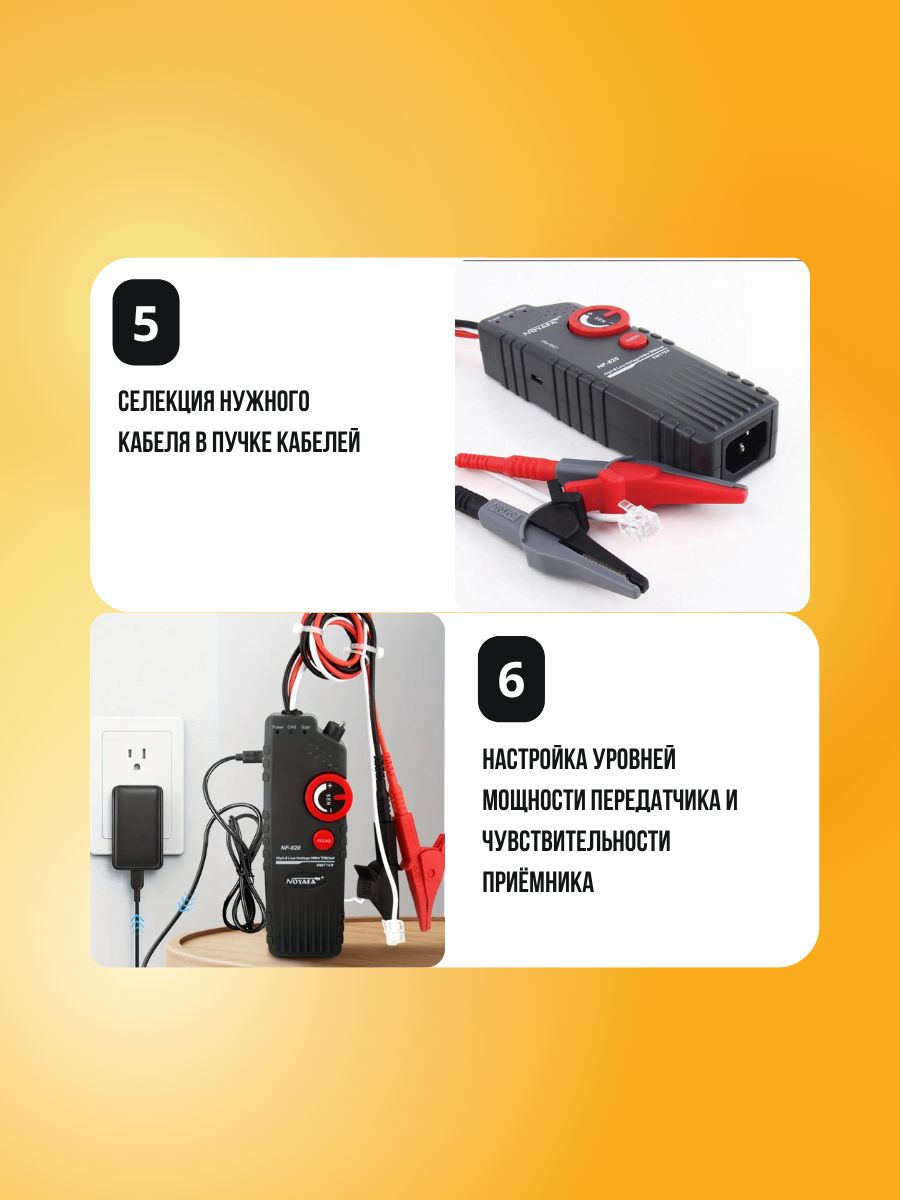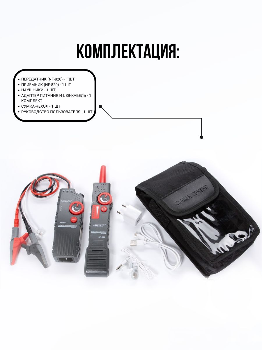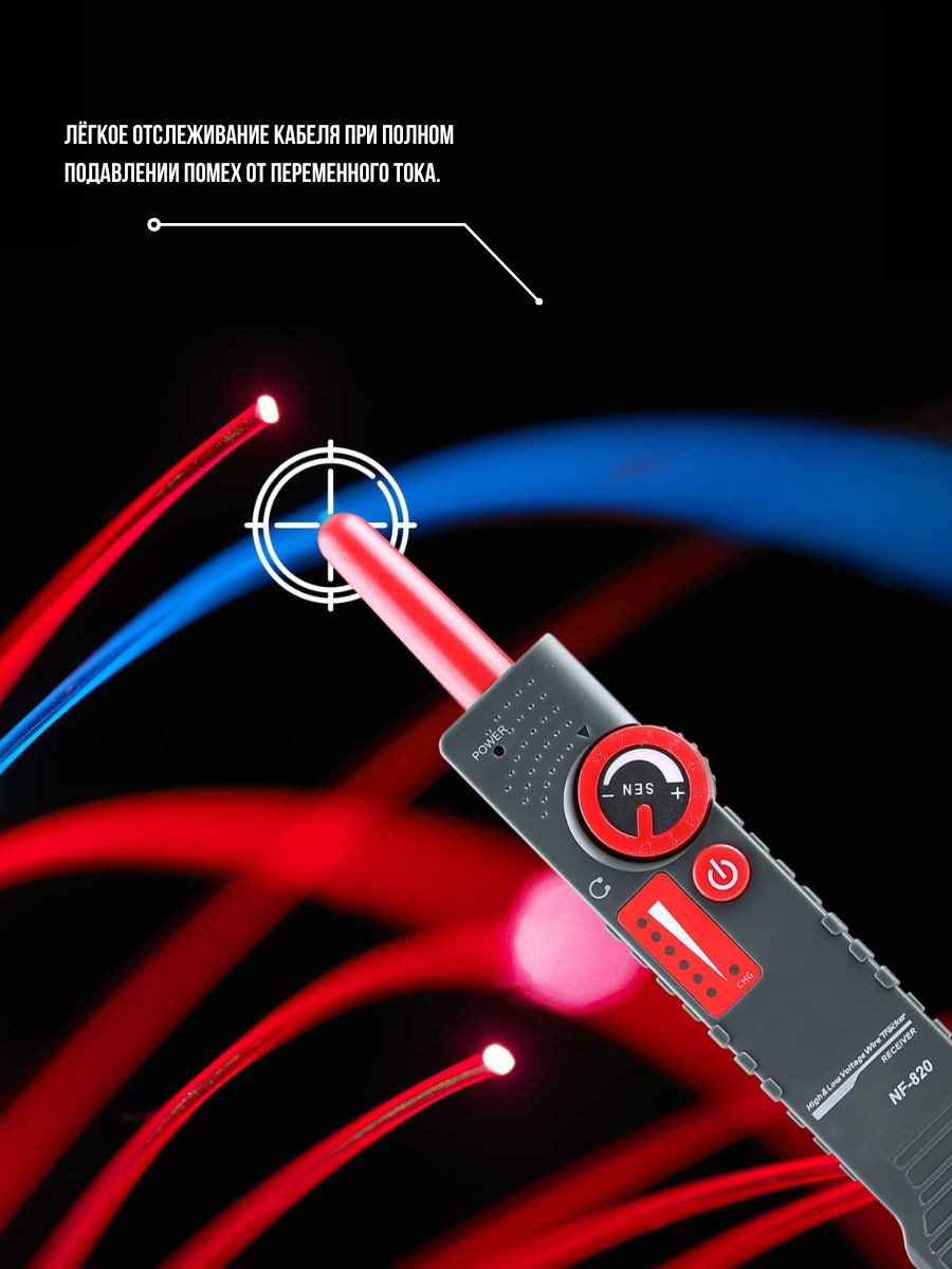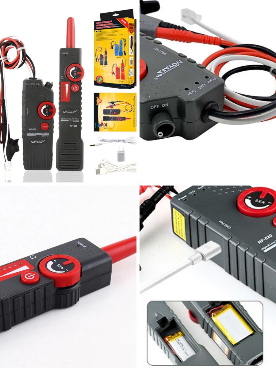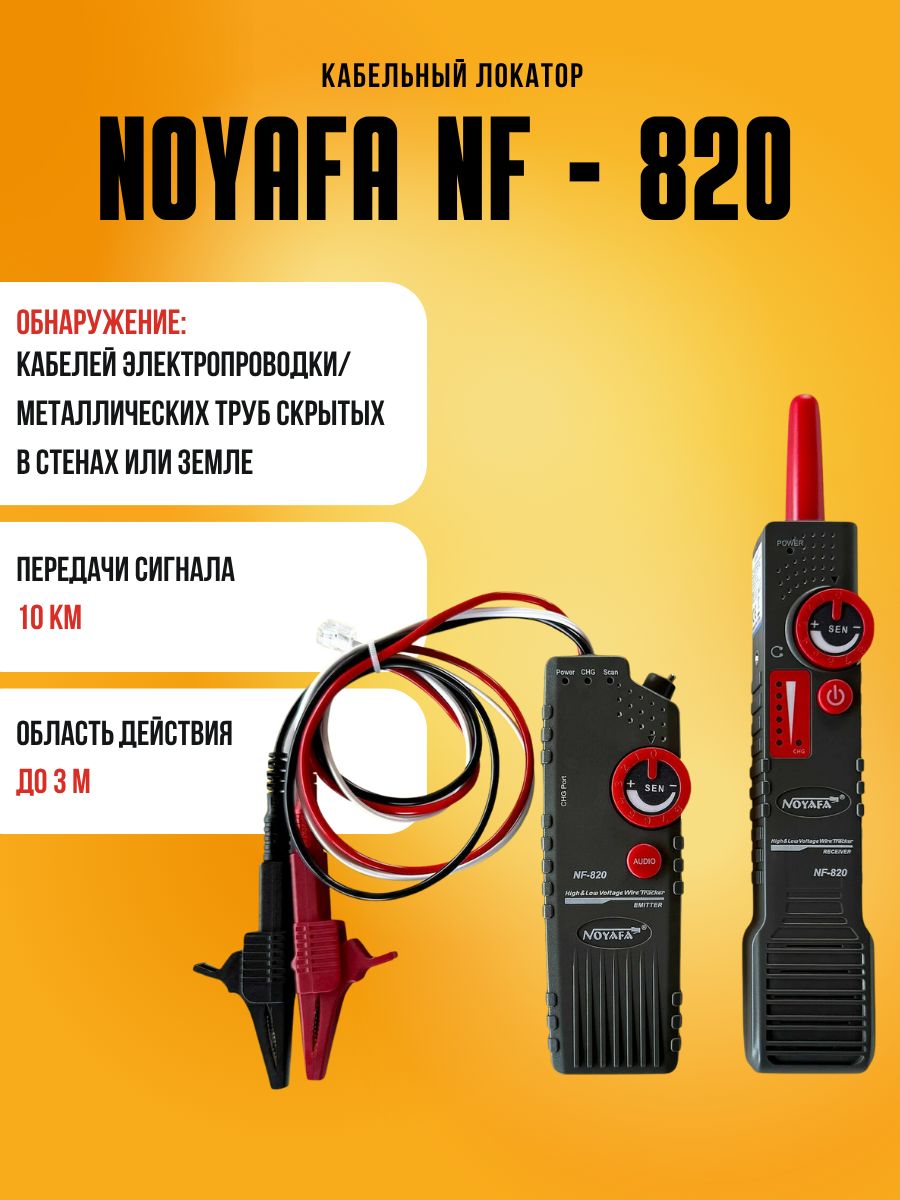 Noyafa NF-820 – комплект аппаратуры, который включает помехозащищённые трассировщики подземных (и других скрытых вариантов) кабелей. Глубина обнаружения достигает 2м. Кроме того, NF-820 позволяет даже отслеживать кабели в среде высокого напряжения (до 400В). Это удобный, практичный инструмент для технического персонала, работающего в области декорирования интерьеров, прокладки кабелей, в телекоммуникациях и т.д. NF-820 работает не только с обесточенными, но и с кабелями под напряжением (до 400В).
