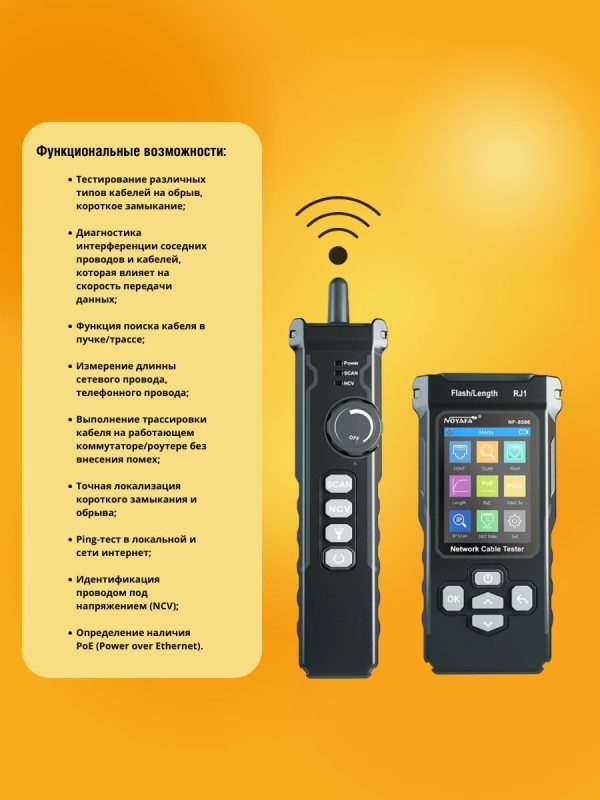 Noyafa-8506 — это многофункциональный кабельный тестер длины кабелей, состоит из одного передатчика, одного приемника.