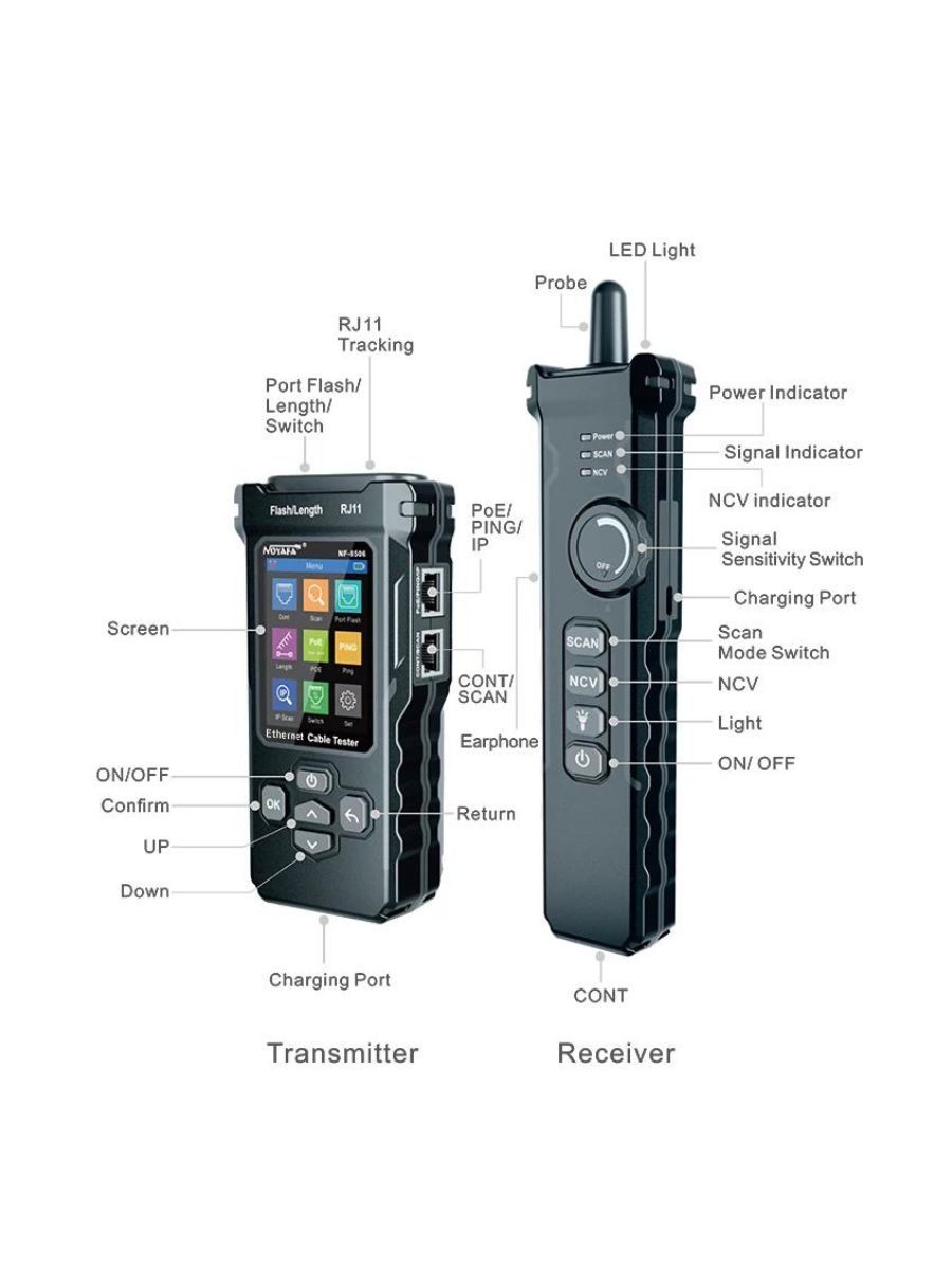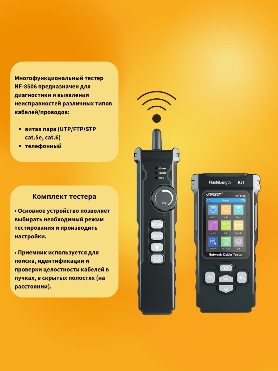 Noyafa-8506 — это многофункциональный кабельный тестер длины кабелей, состоит из одного передатчика, одного приемника.