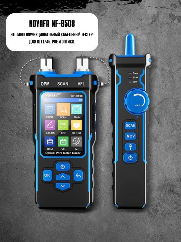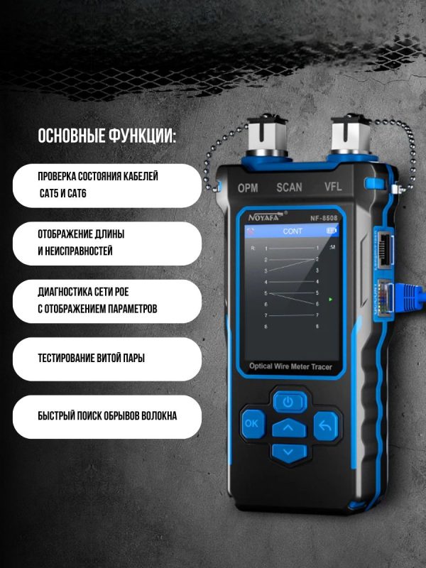 Измеритель оптической мощности и визуальный локатор неисправностей — он может измерять 7 стандартных длин волн, 850/1300/1310/1490/1550/1625/1650, диапазон испытаний -70 дБм ~ + 10 дБм, источник красного света мощностью 10 МВт.