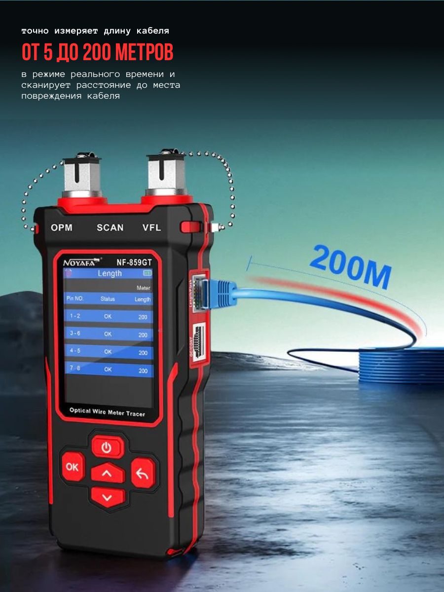 Поддерживает измерения длины кабеля от 5 метров до 200 метров, подходящих для различной длины кабеля.