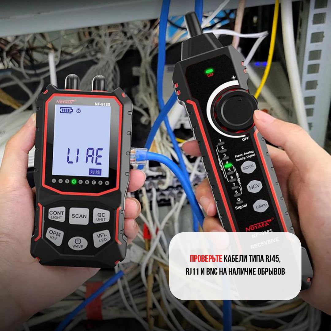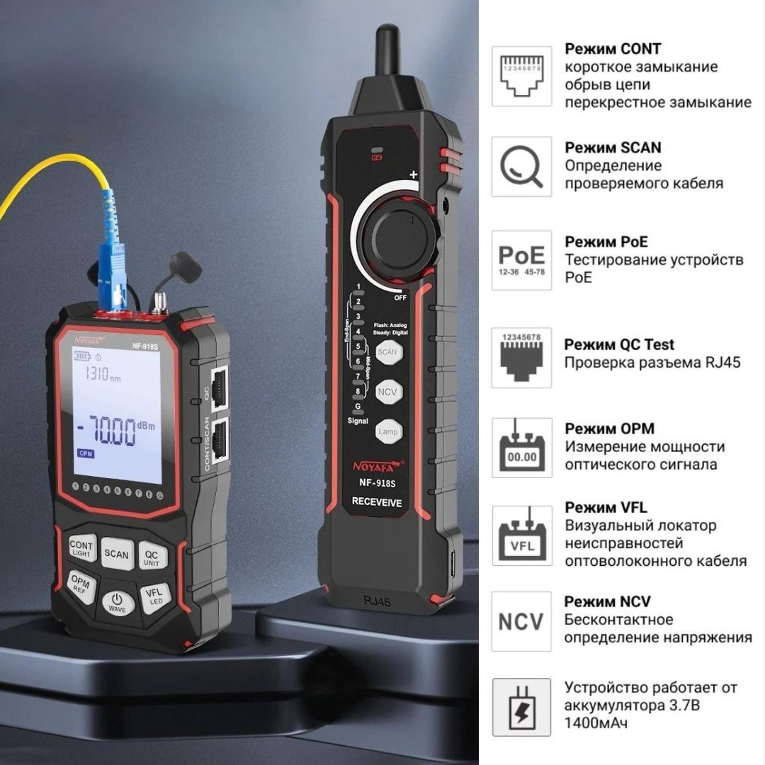 NF-918S- многофункциональный тестер, предназначен для тестирования витых пар, обнаружения кабеля, обрыва и может использоваться при монтаже и обслуживании низковольтных коммуникационных и оптических сетей.
