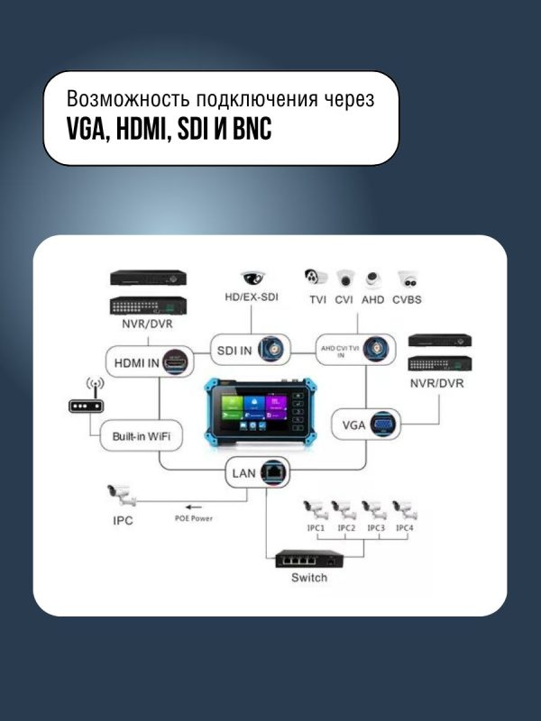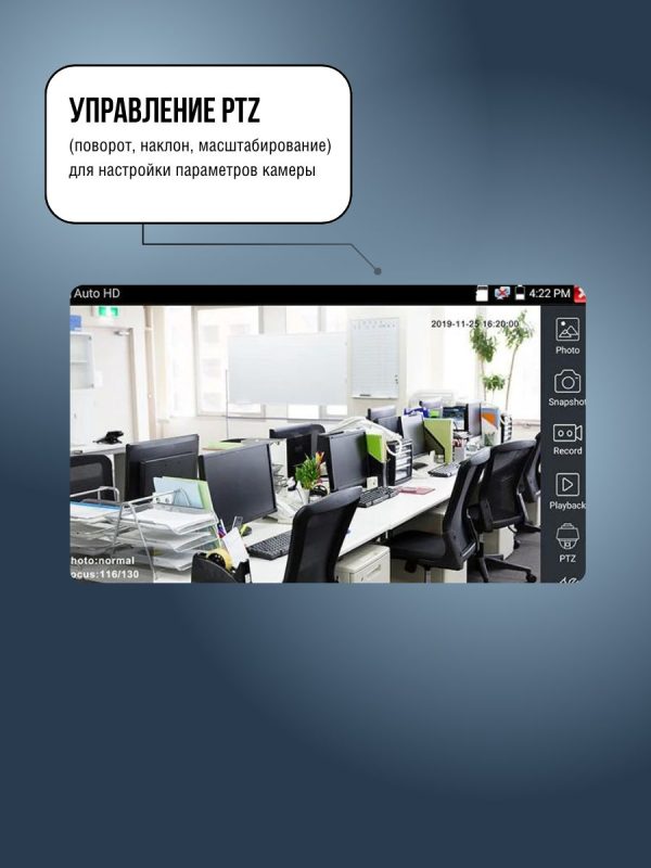 Auto HD App: Авто распознает HD Coax Camera Type и разрешение, поддержка снимка, видеозапись и воспроизведение, коаксиальный PTZ и меню Call OSD