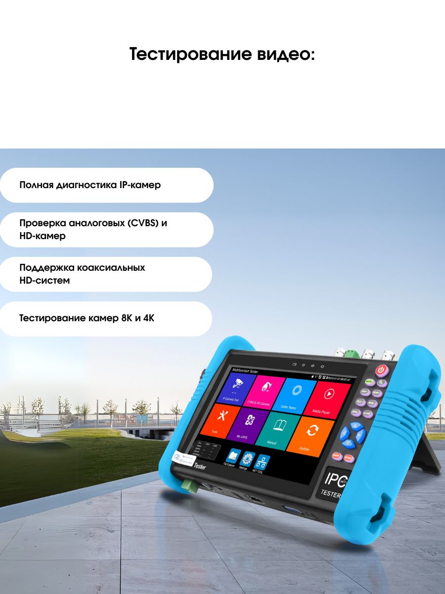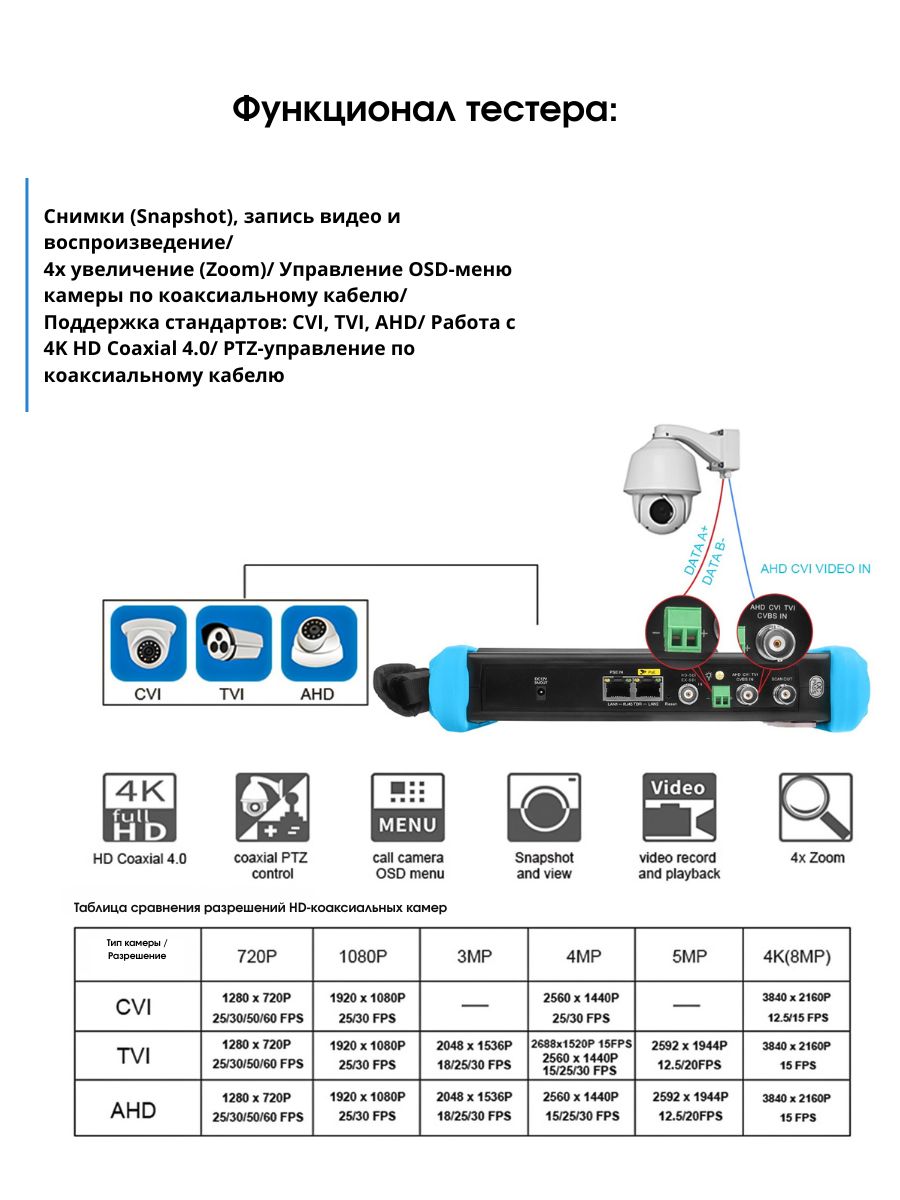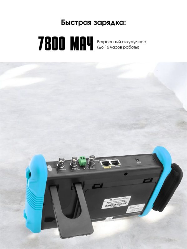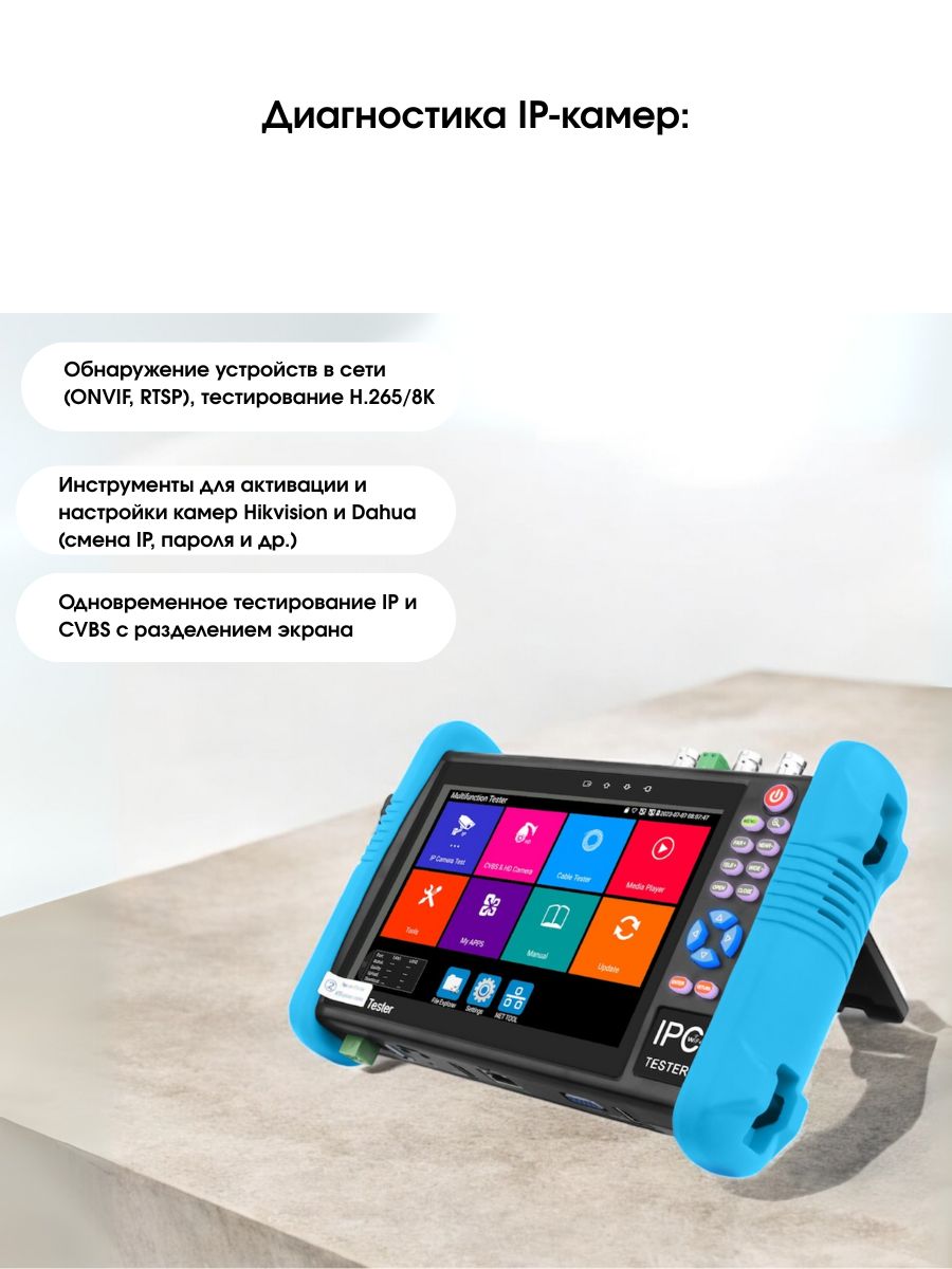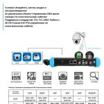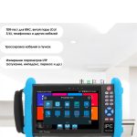 - Поддержка разных камер. Устройство поможет провести проверку или настройку камер AHD, CVI, TVI, IP с разрешением до 8 Мп. Это устройство совместимо с разными моделями камер, что делает его универсальным монитором-тестером.