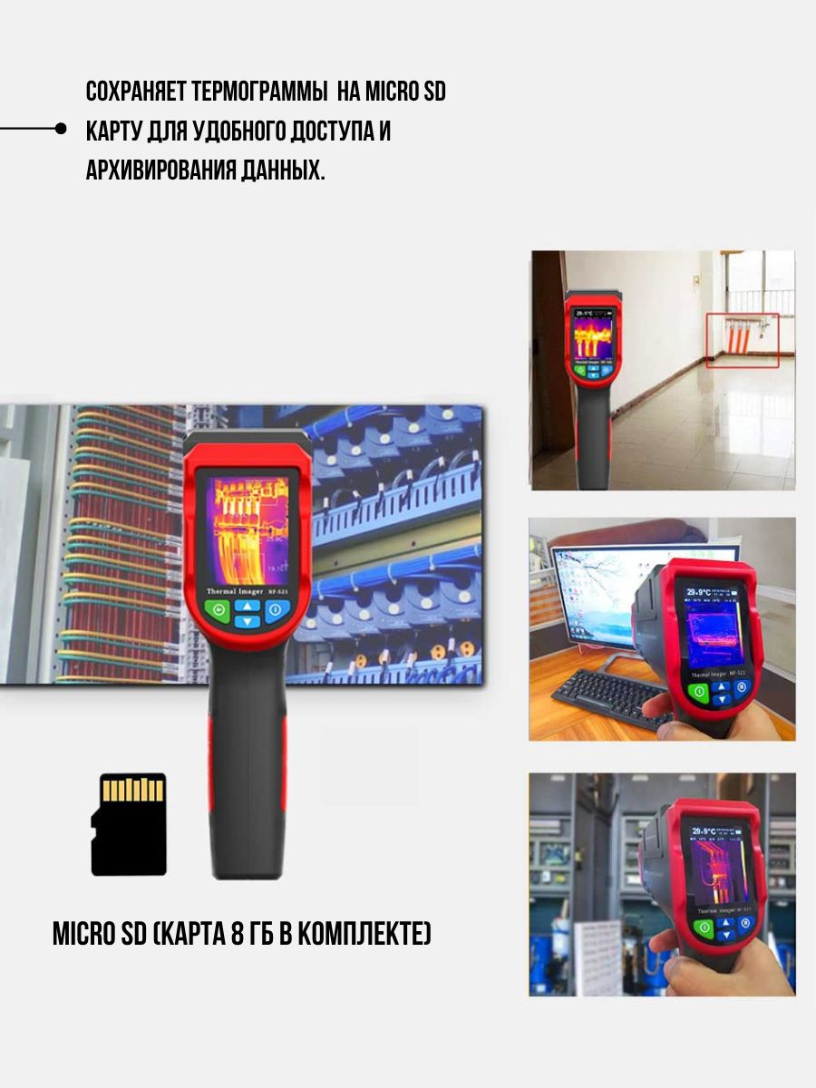 Стандартная карта памяти 8 ГБ может сохранять большое количество изображений и данных и создавать высококачественные инфракрасные изображения, что является полезным инструментом для устранения неисправностей.