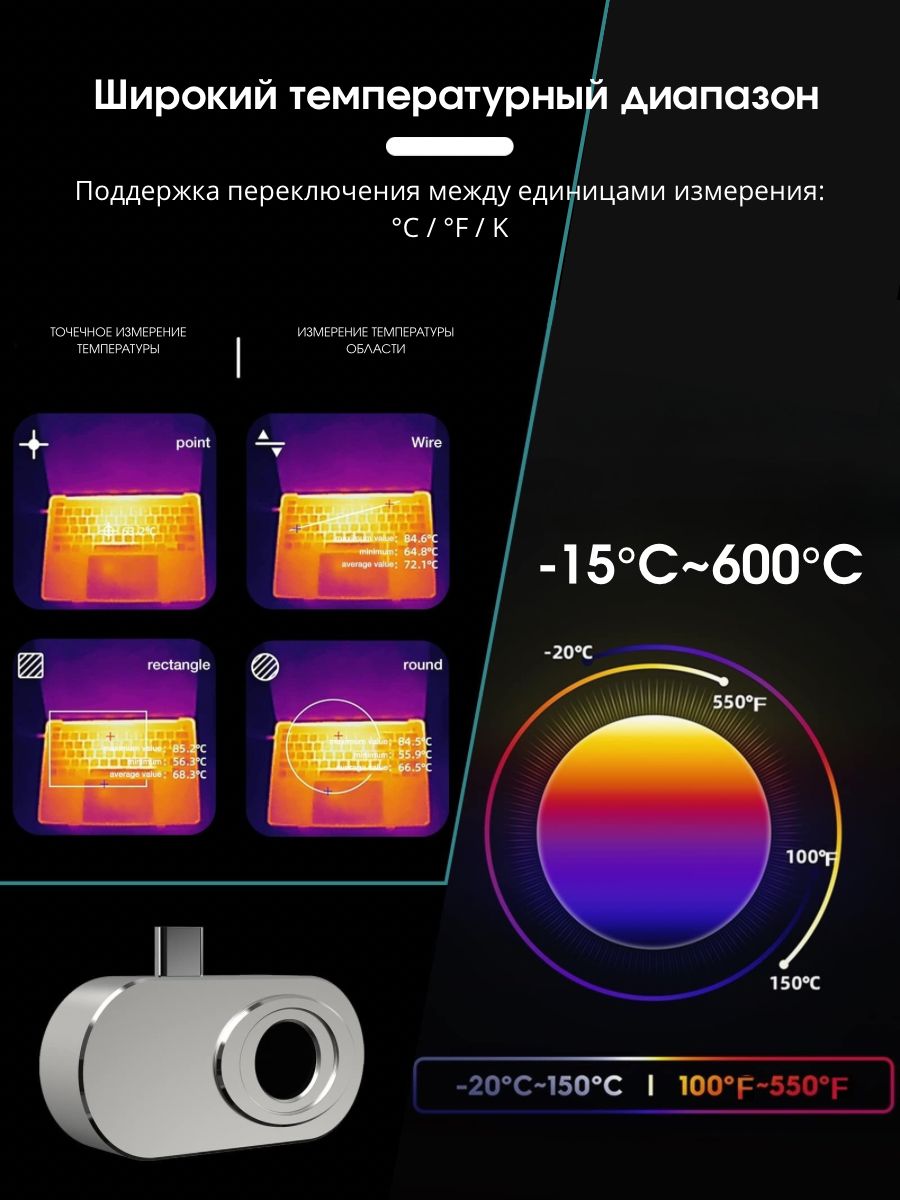 - Портативный дизайн – компактный тепловизор помещается в карман и готов к использованию в любое время и в любом месте.