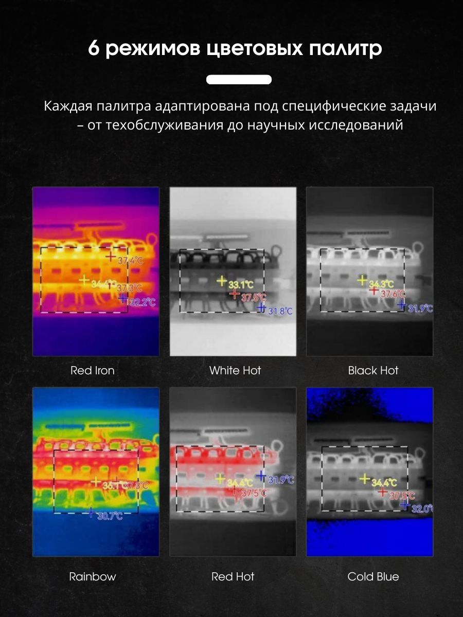 - Цветовые палитры (6 режимов): красный (iron red), белый (white hot), чёрный (black hot), радуга (rainbow), яркий красный (red hot), холодный синий (cold blue)
